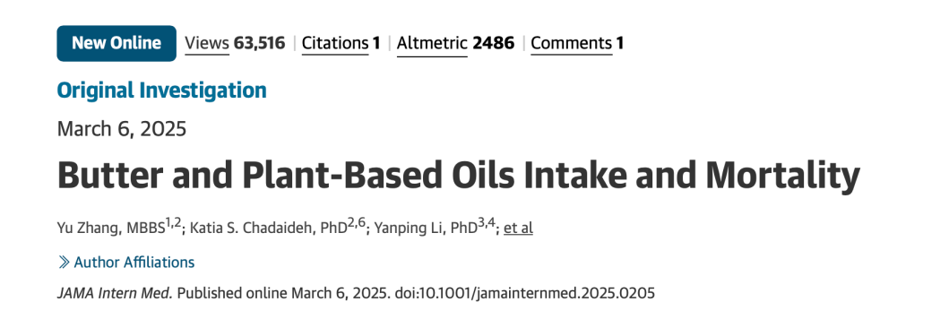 2025年3月,《美国医学会杂志-内科学》刊发的一项随访33年涉及22万成年人的研究, 发现用植物油代替动物油(黄油),死亡风险大大降低!