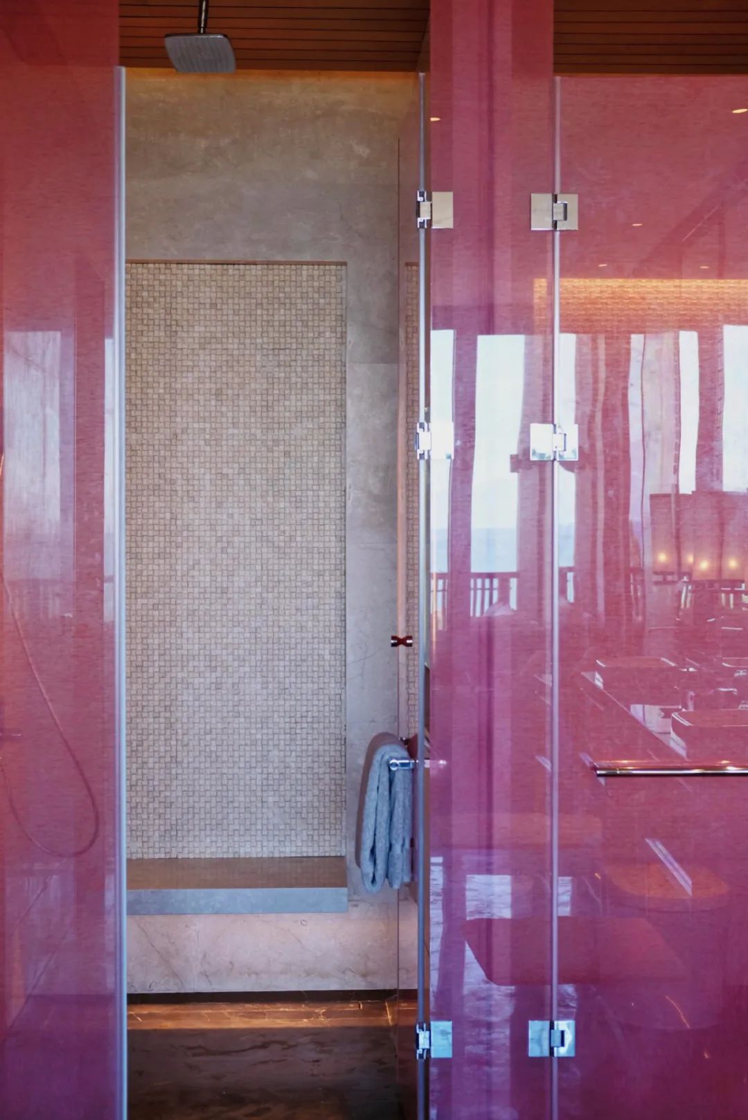 有趣的是,嘉佩乐房内的配色却很大胆!客厅和房间是端庄米灰色系,而浴室却是酒店君最爱的粉色~