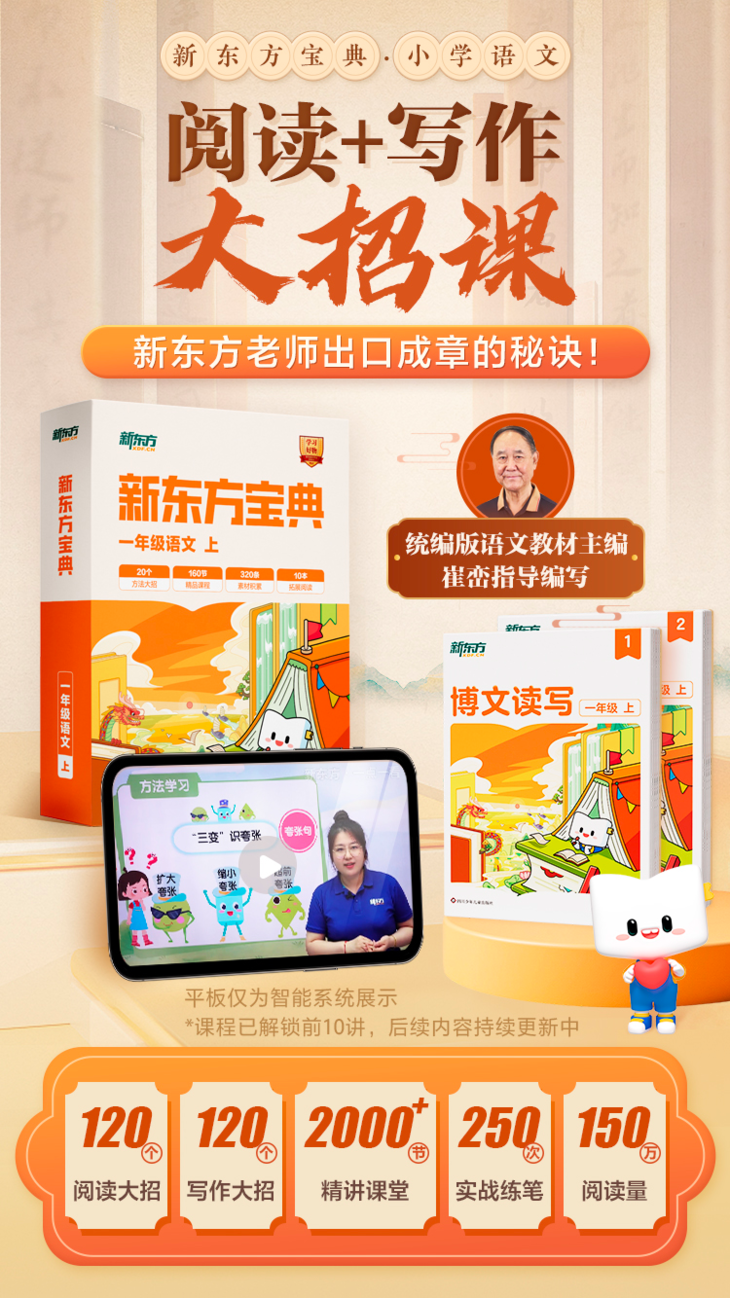 《新东方小学语文宝典》是统编版语文教材主编崔峦指导编写的阅读+写作大招课。是基于新东方原线下泡泡少儿的《博文读写》教材升级研发的AI课,线下经过了数百万的学员验证过的。