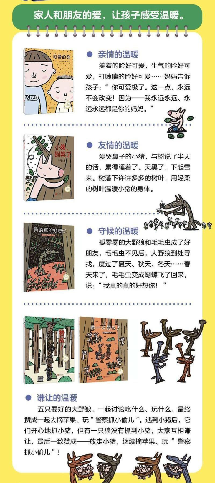 这套盒里精挑细选10册宫西达也不同系列的经典绘本,分别是——《狼和小猪系列》6本;《超人系列》3本;超温暖、适合亲子共读的《可爱的你》