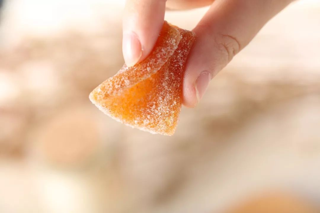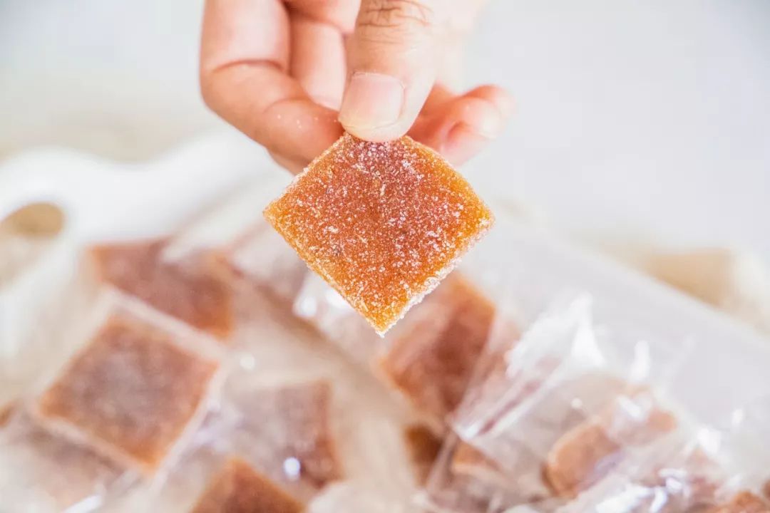 用生姜榨汁做成软糖,入口辣而不辛,厚实绵密,口感Q弹软糯,吃完姜糖会发热,从而帮助身体排出湿气。