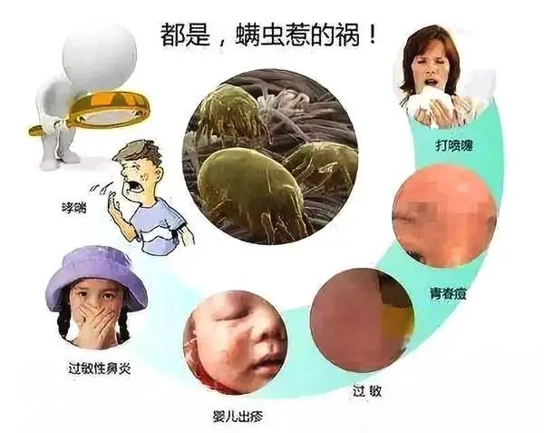 常见的皮肤过敏、皮肤瘙痒、闭口、痘痘等皮肤病,都是螨虫在作祟。甚至还会增加哮喘的发病率。