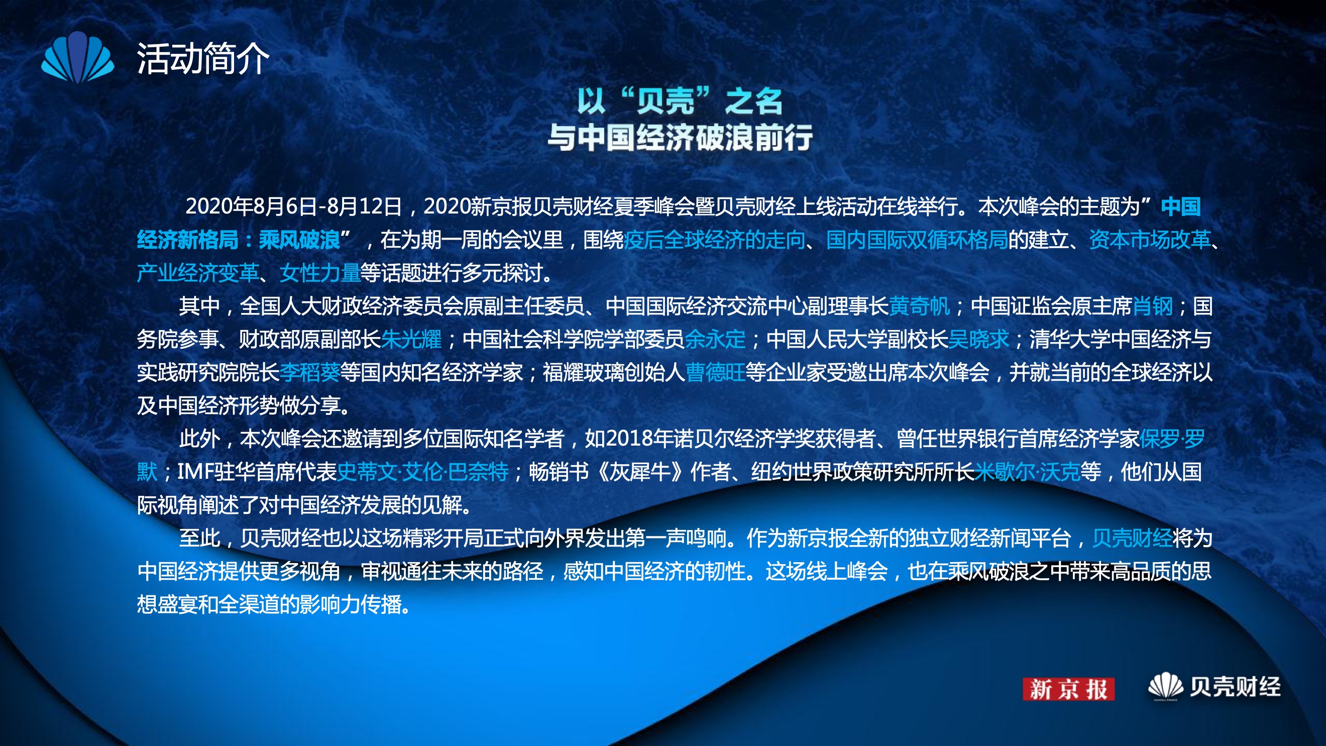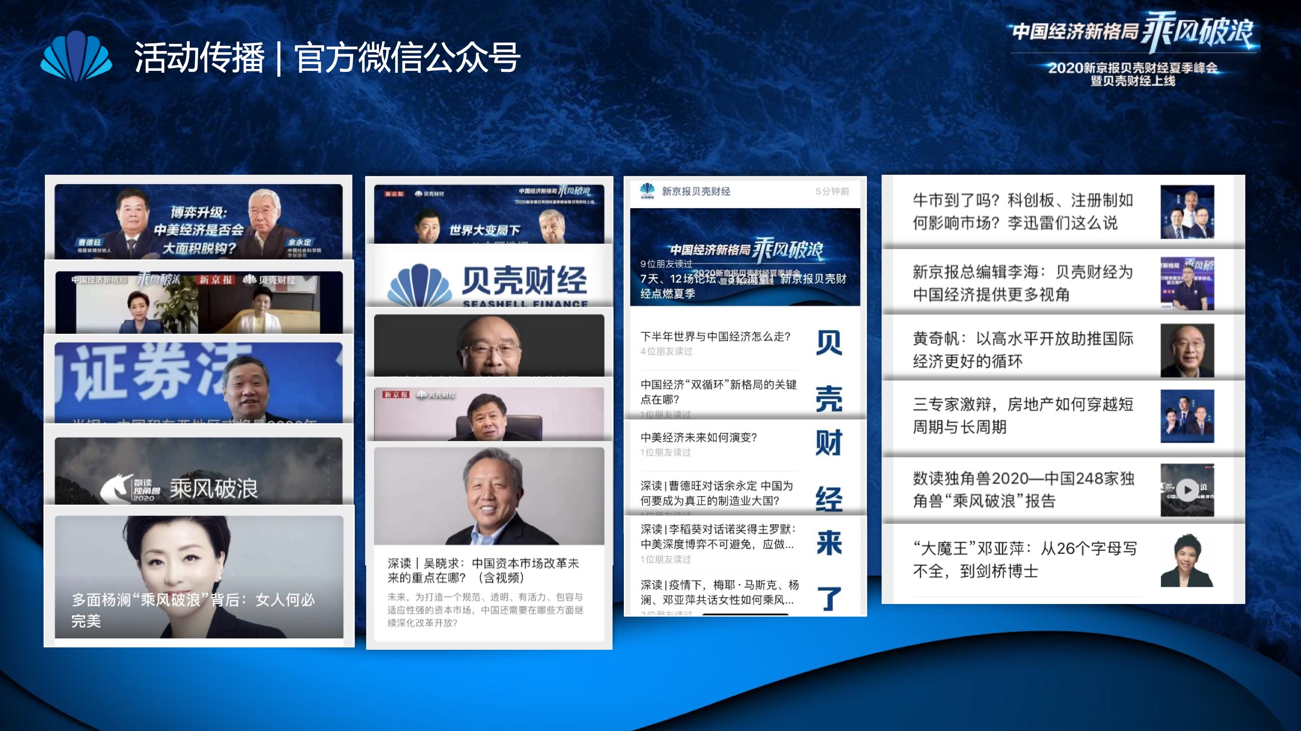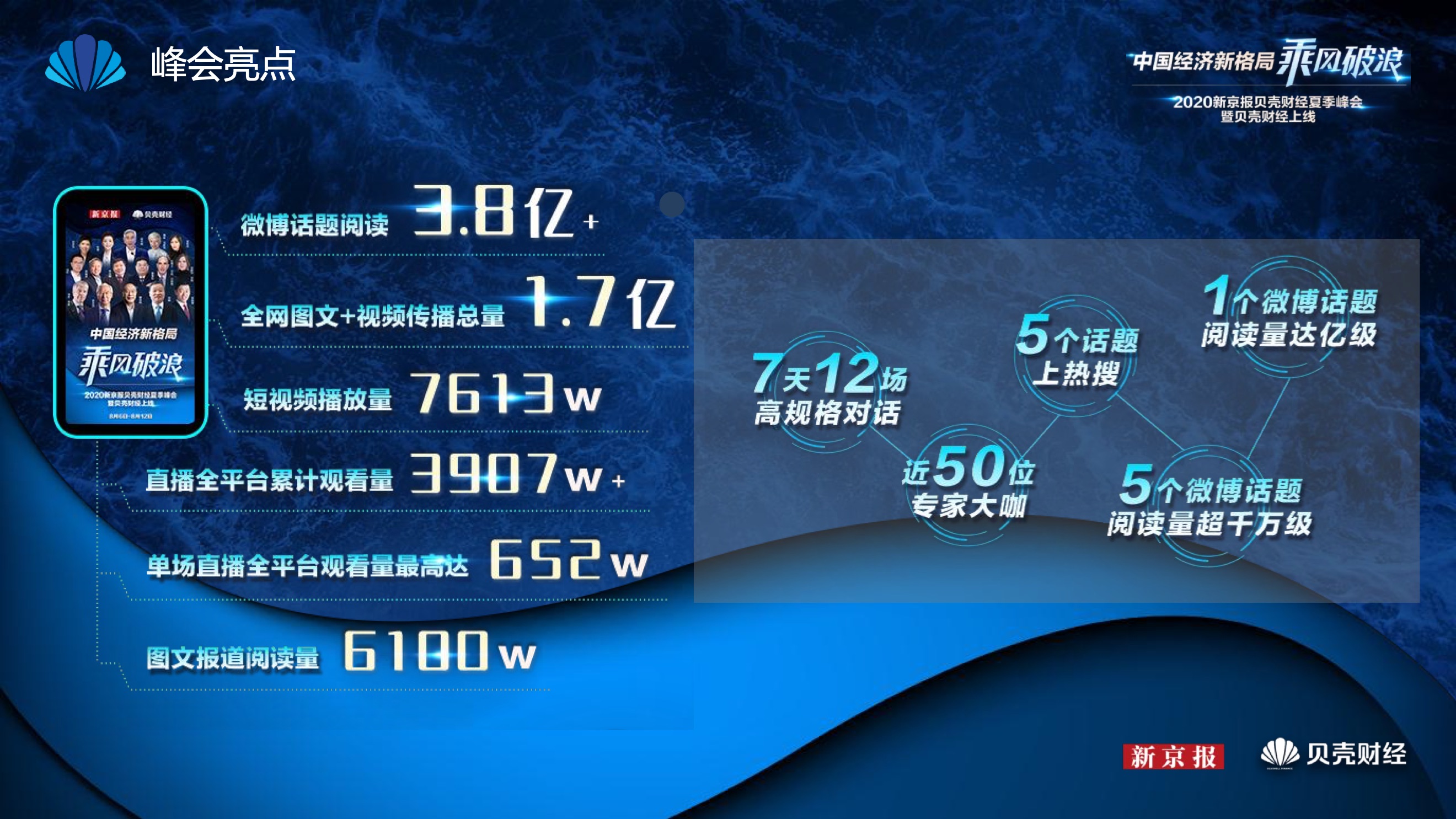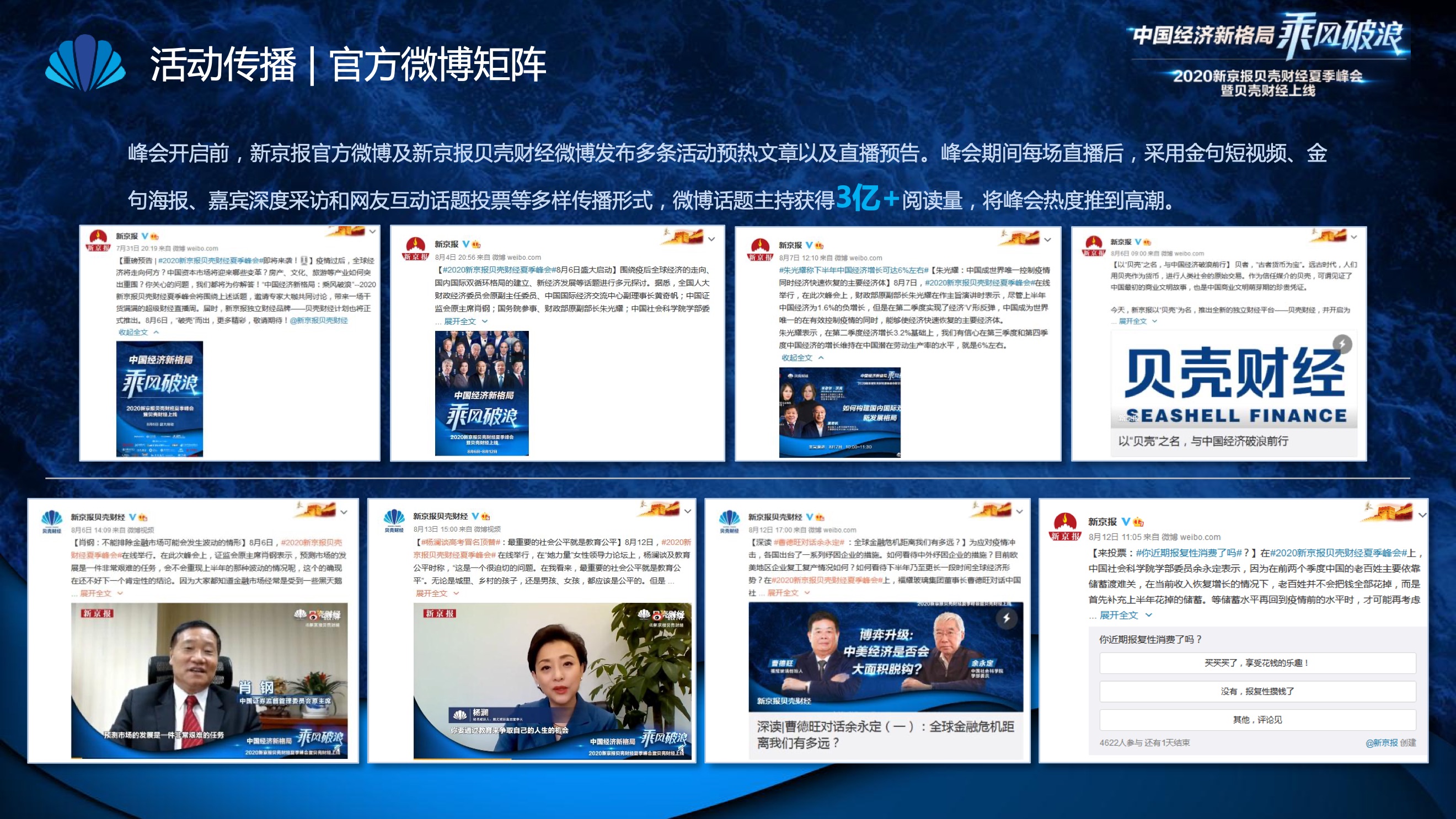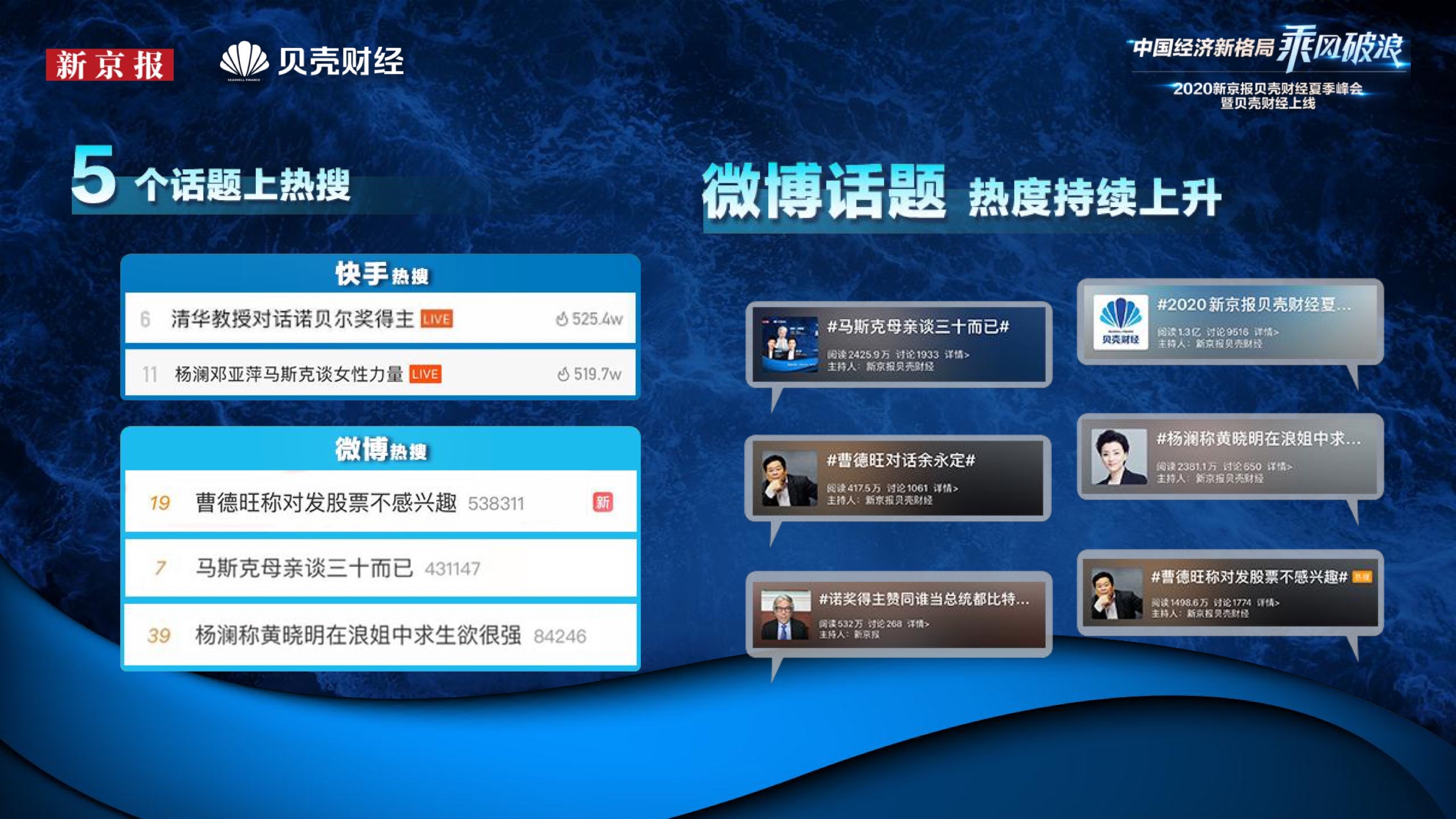 2020年8月6日-8月12日,2020新京报贝壳财经夏季峰会暨贝壳财经上线活动举行,本次峰会的主题为“中国经济新格局:乘风破浪”。7天12场高规格对话中,近50位专家大咖围绕疫后全球经济的走向、国内国际双循环格局的建立、资本市场改革、产业经济变革、女性力量等话题进行多元探讨,5个微博话题阅读量超千万、1个微博话题阅读量超亿,5个话题上热搜。