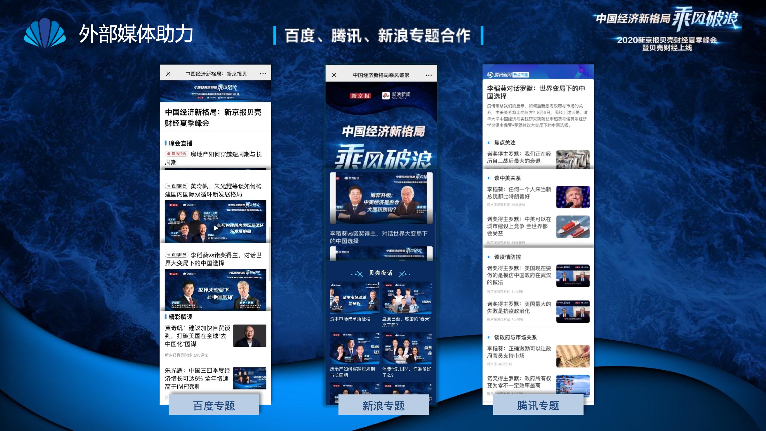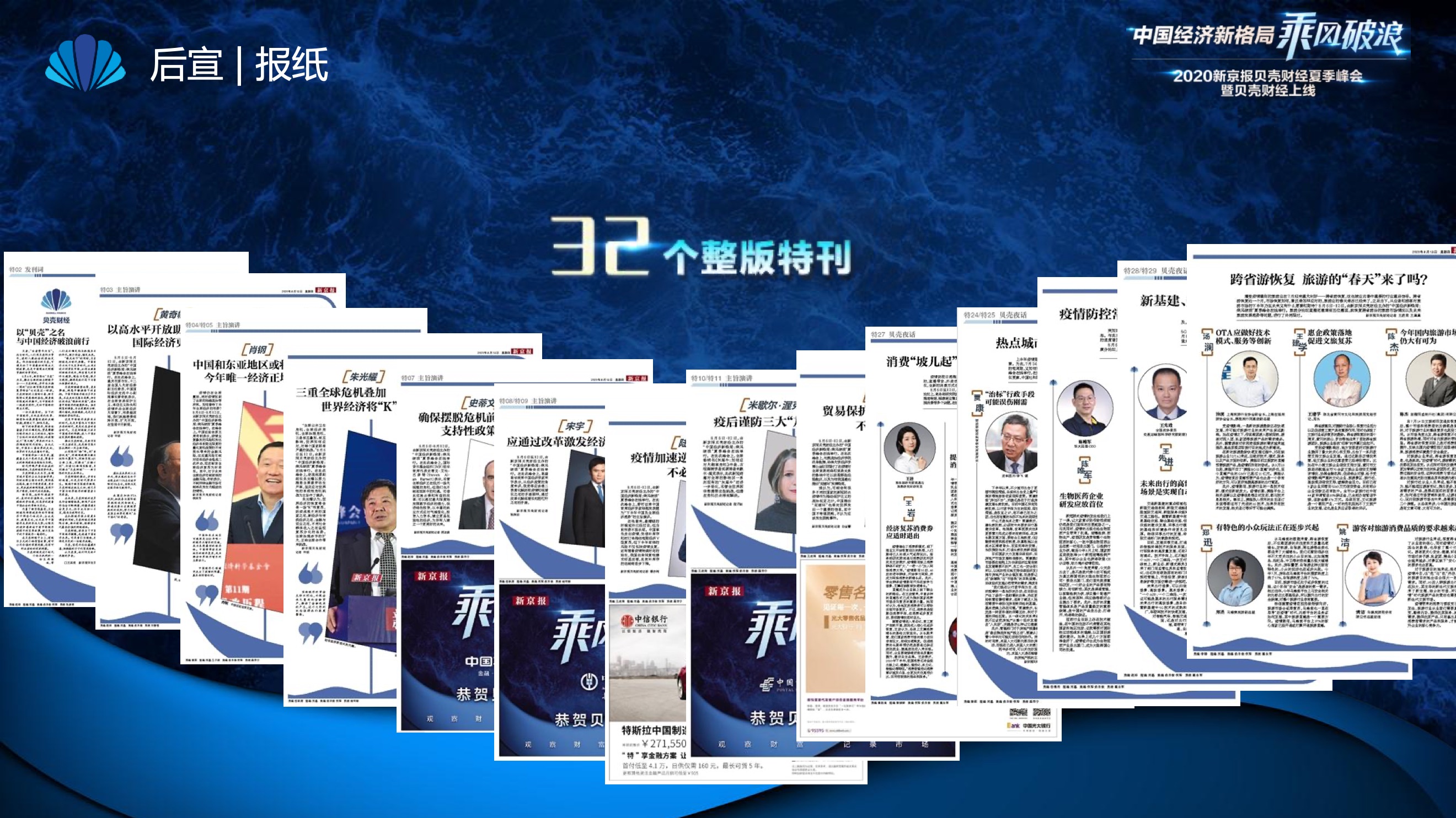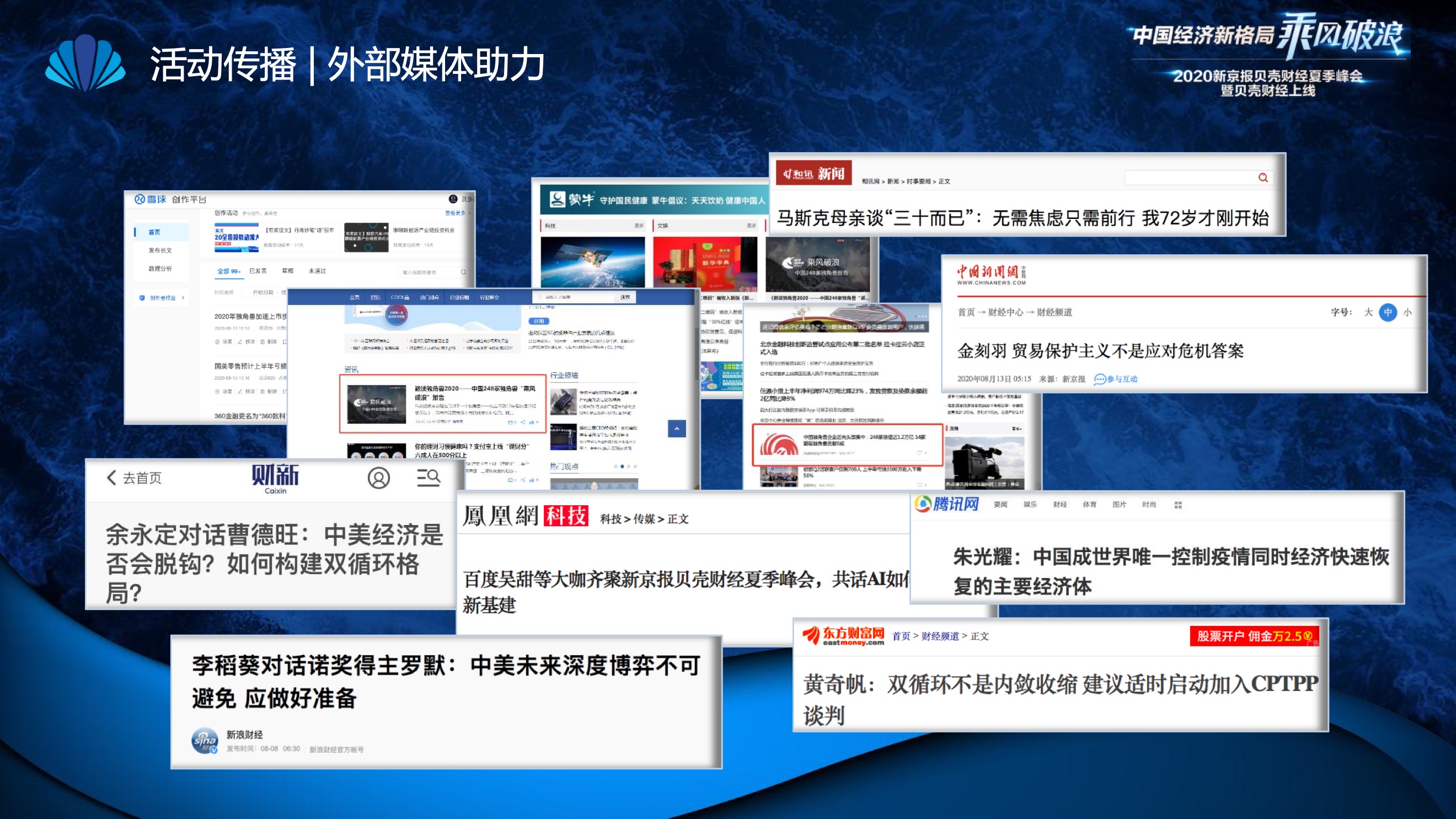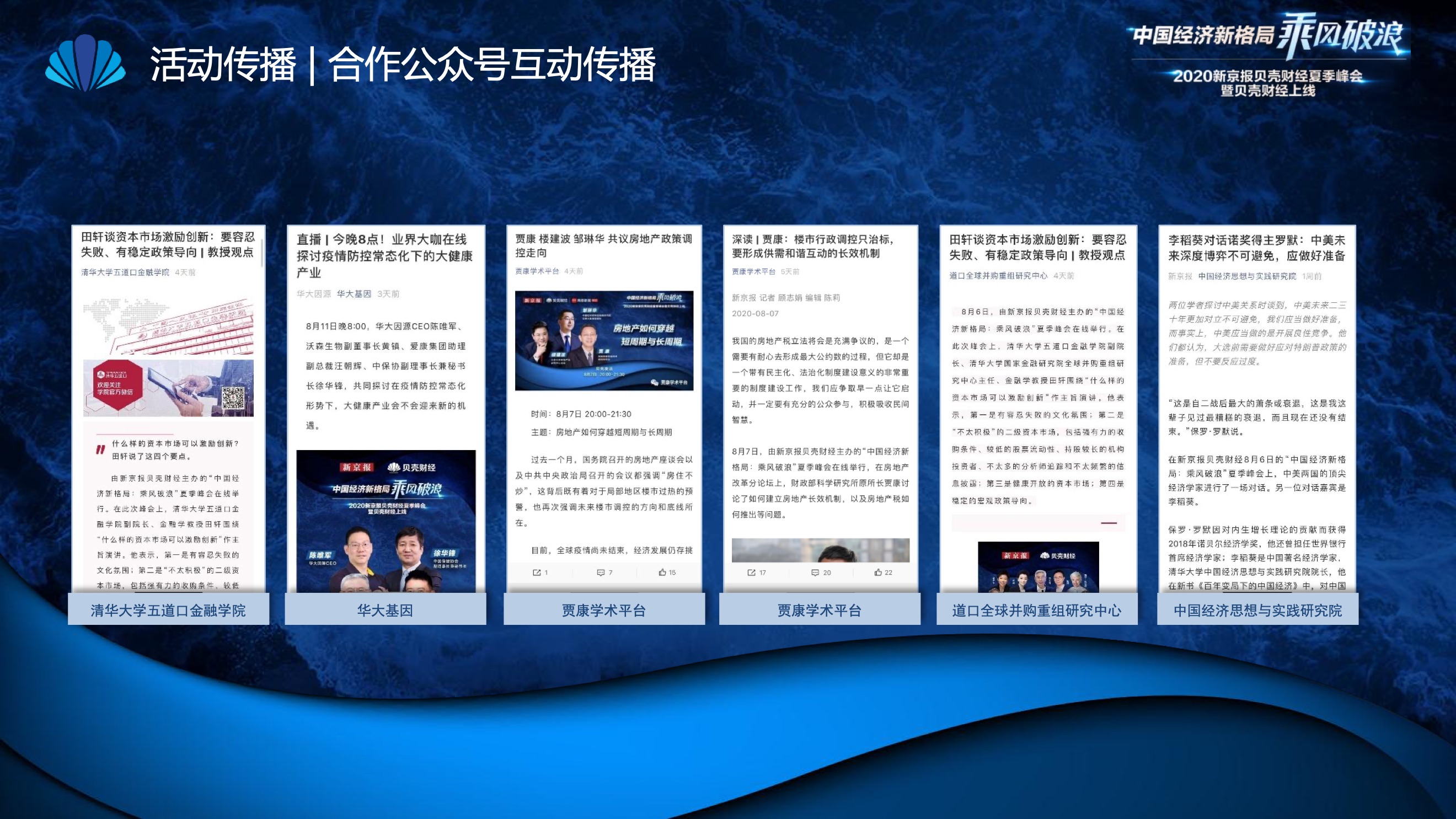 2020年8月6日-8月12日,2020新京报贝壳财经夏季峰会暨贝壳财经上线活动举行,本次峰会的主题为“中国经济新格局:乘风破浪”。7天12场高规格对话中,近50位专家大咖围绕疫后全球经济的走向、国内国际双循环格局的建立、资本市场改革、产业经济变革、女性力量等话题进行多元探讨,5个微博话题阅读量超千万、1个微博话题阅读量超亿,5个话题上热搜。