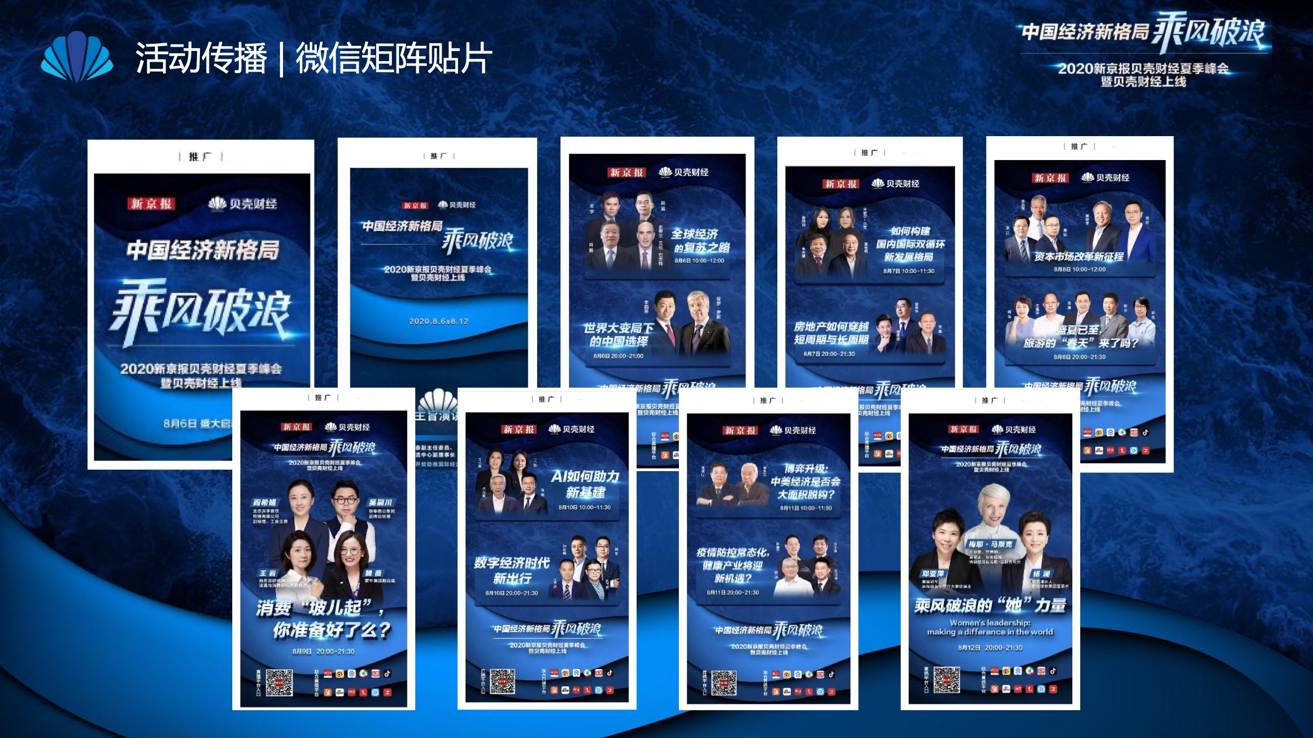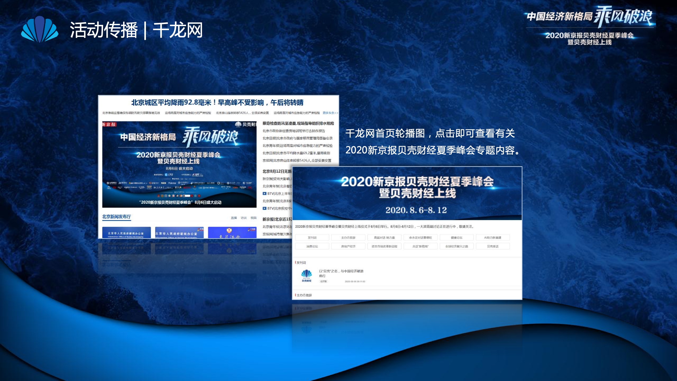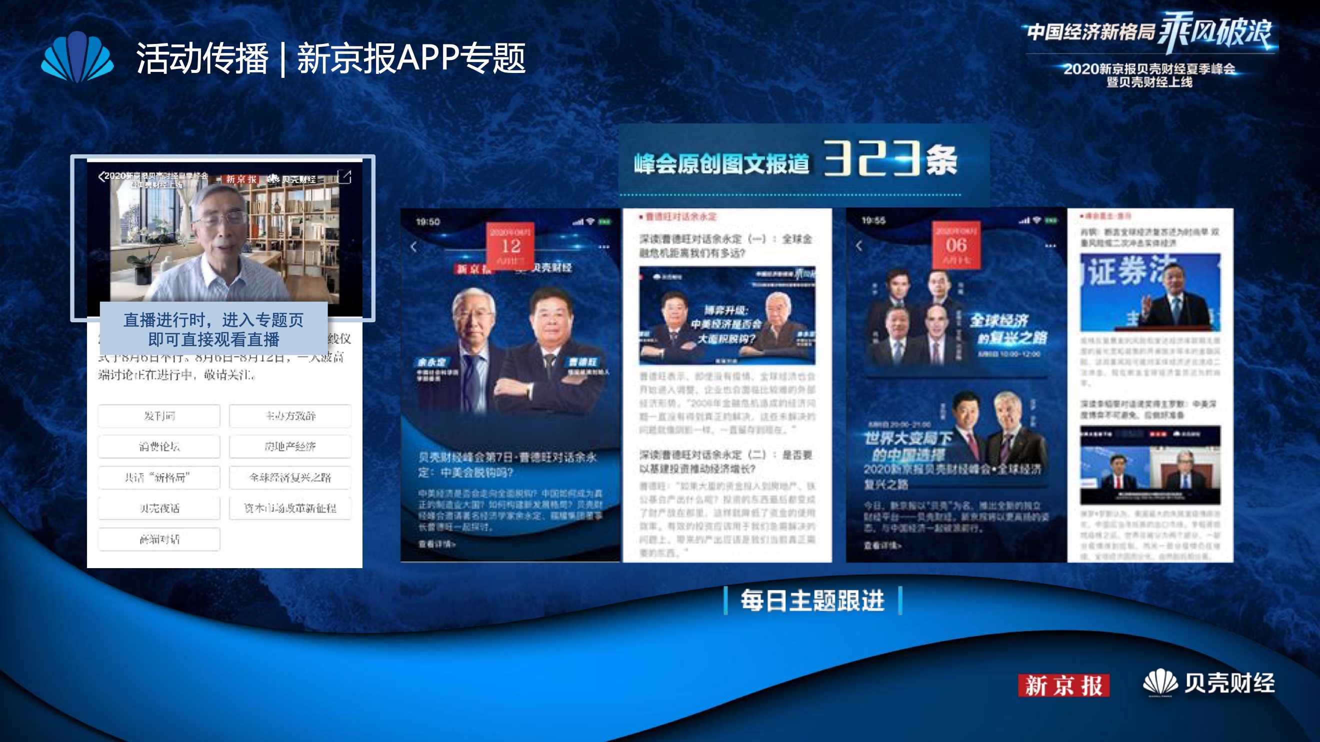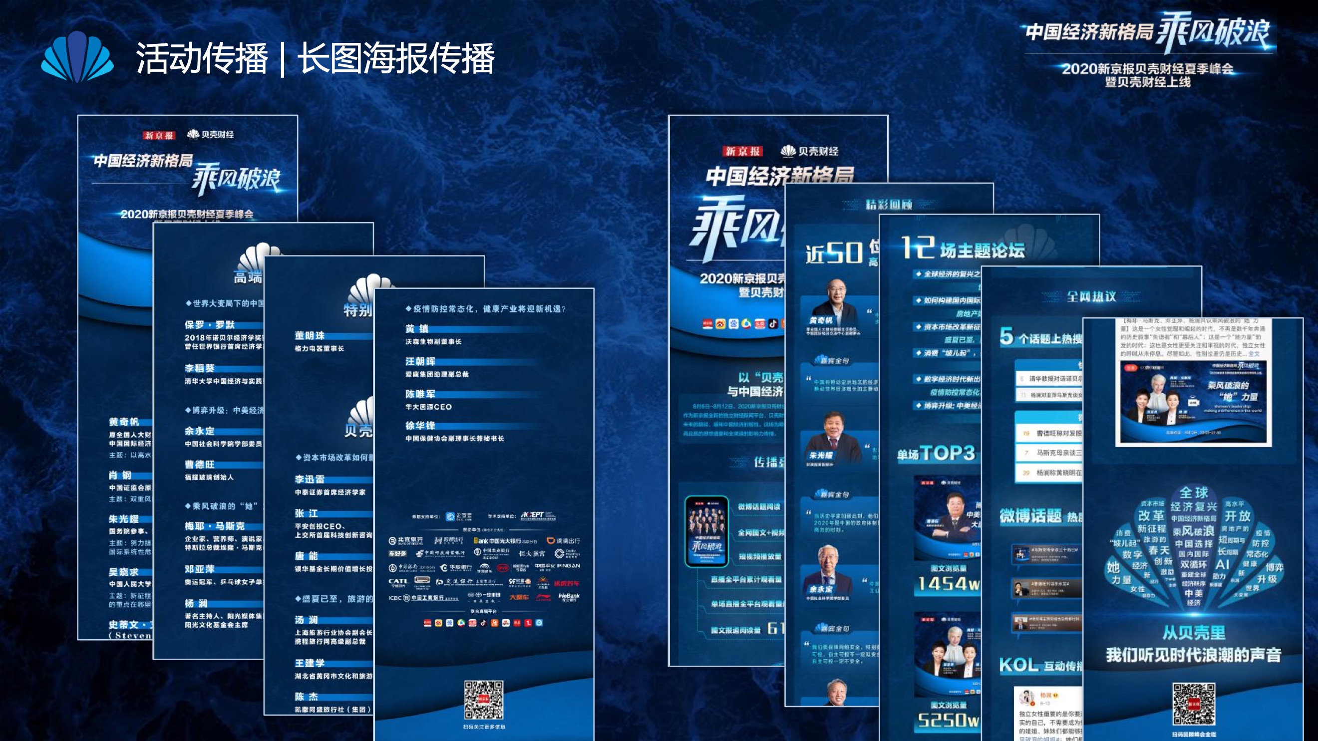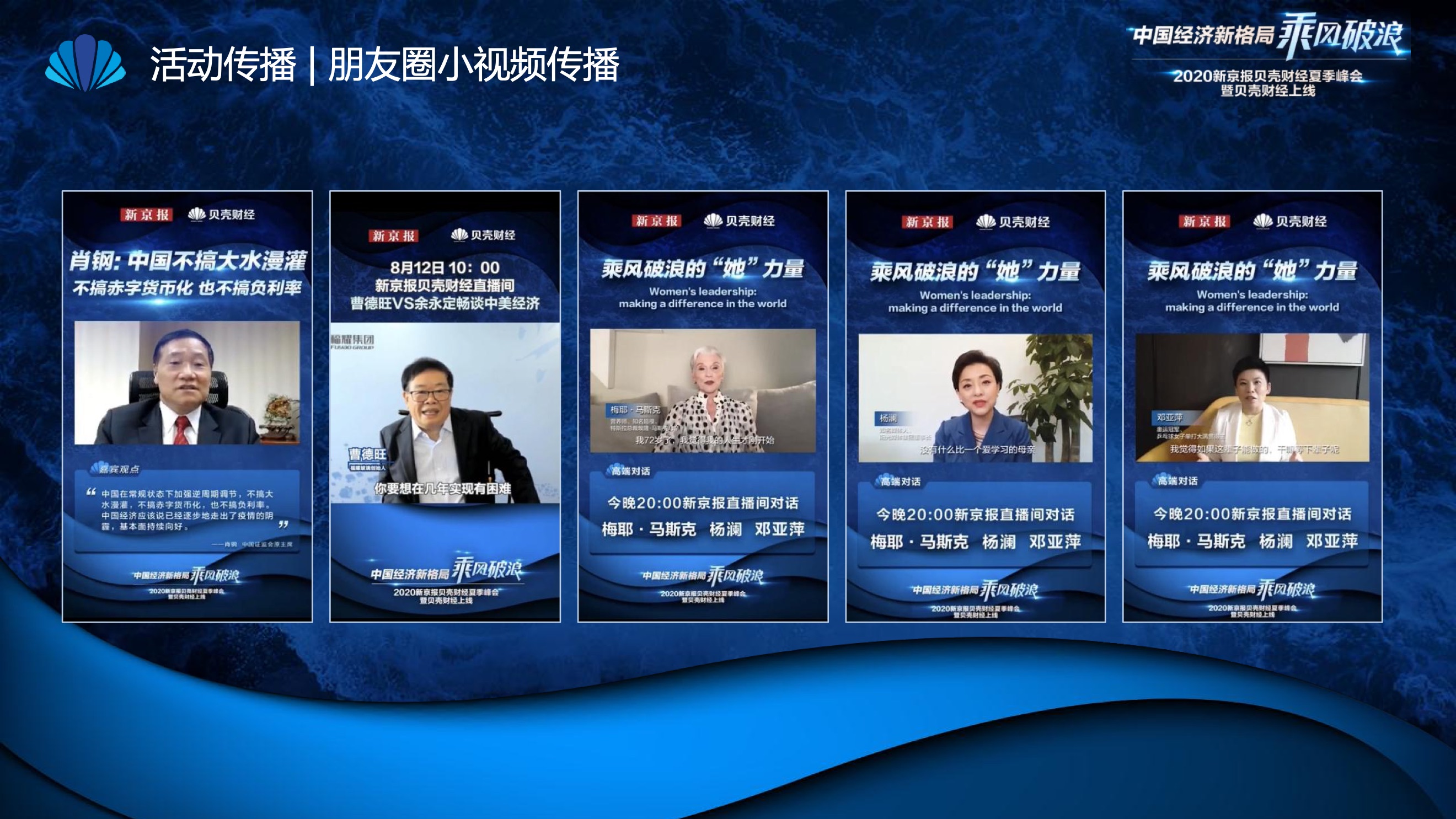 2020年8月6日-8月12日,2020新京报贝壳财经夏季峰会暨贝壳财经上线活动举行,本次峰会的主题为“中国经济新格局:乘风破浪”。7天12场高规格对话中,近50位专家大咖围绕疫后全球经济的走向、国内国际双循环格局的建立、资本市场改革、产业经济变革、女性力量等话题进行多元探讨,5个微博话题阅读量超千万、1个微博话题阅读量超亿,5个话题上热搜。