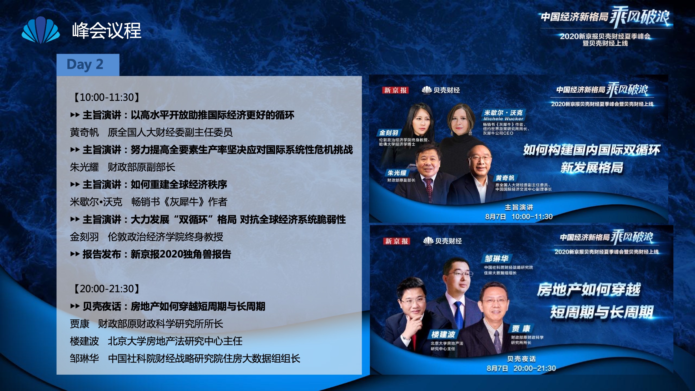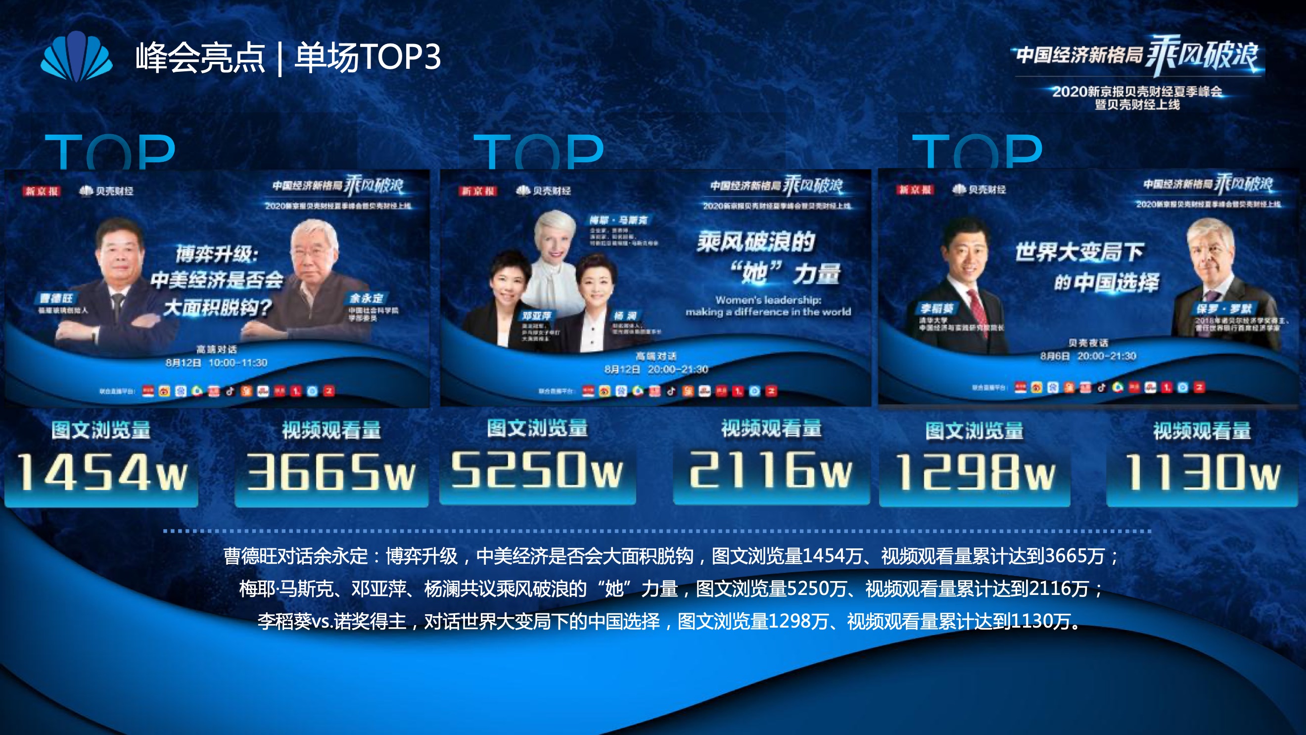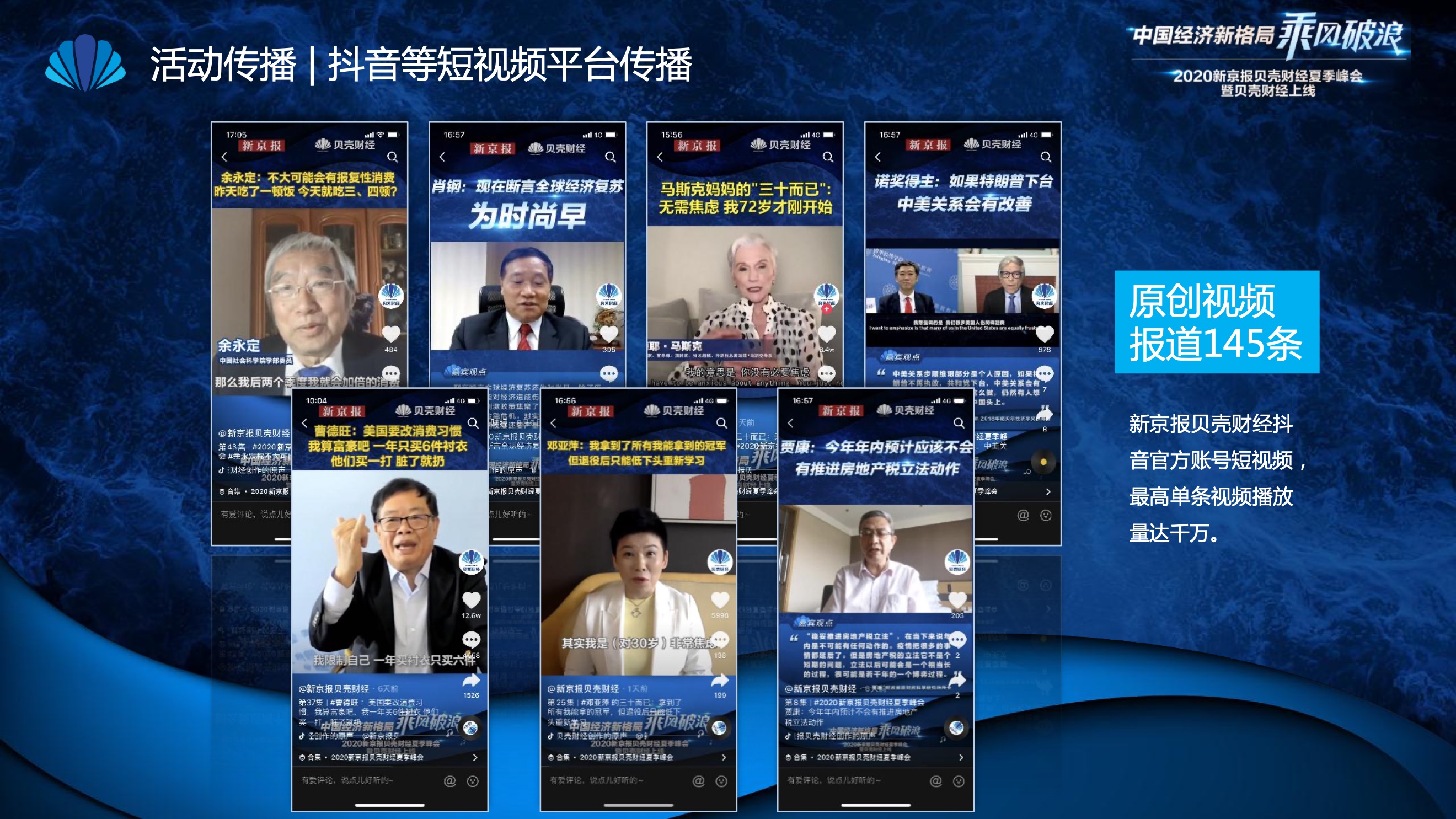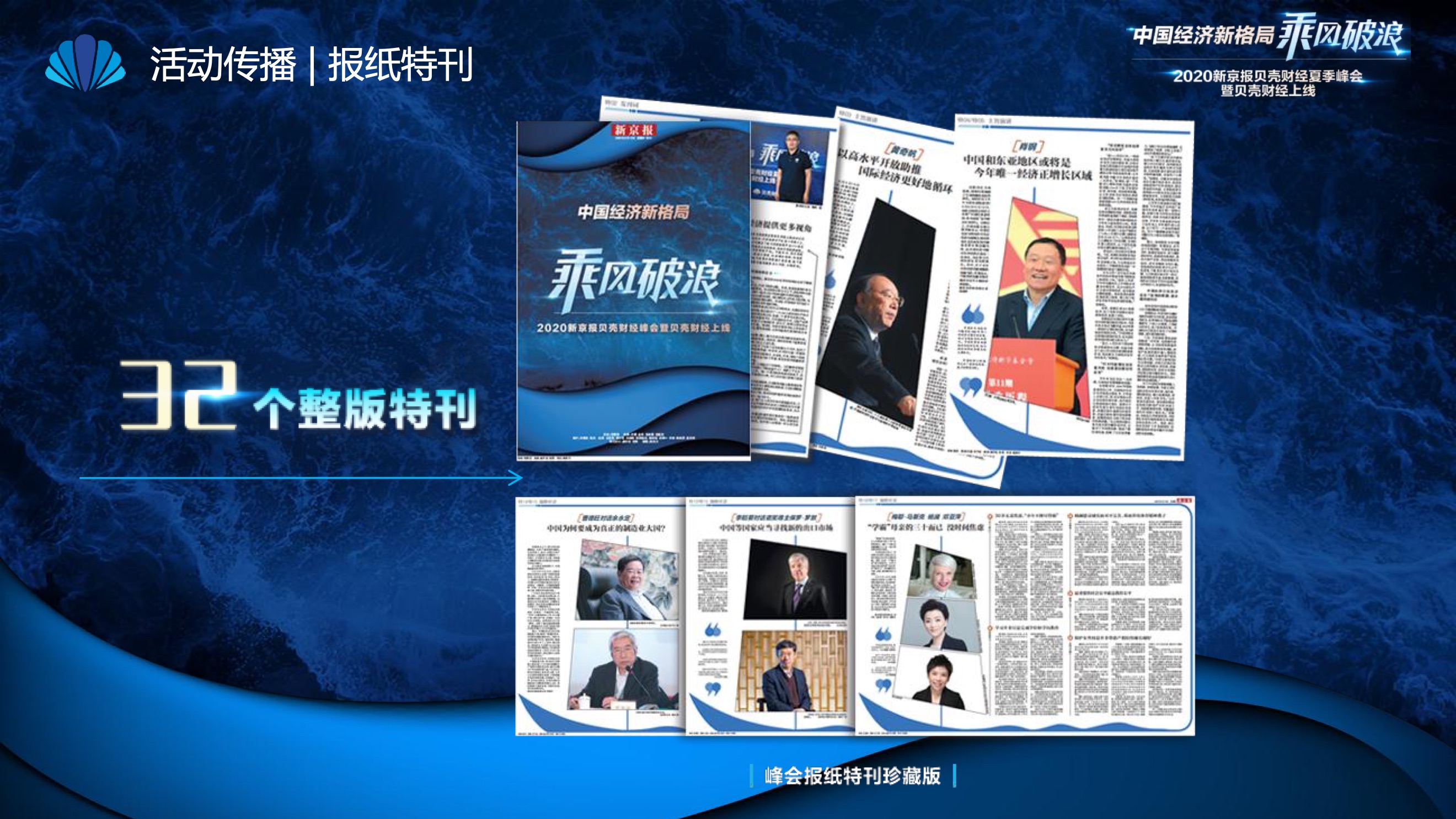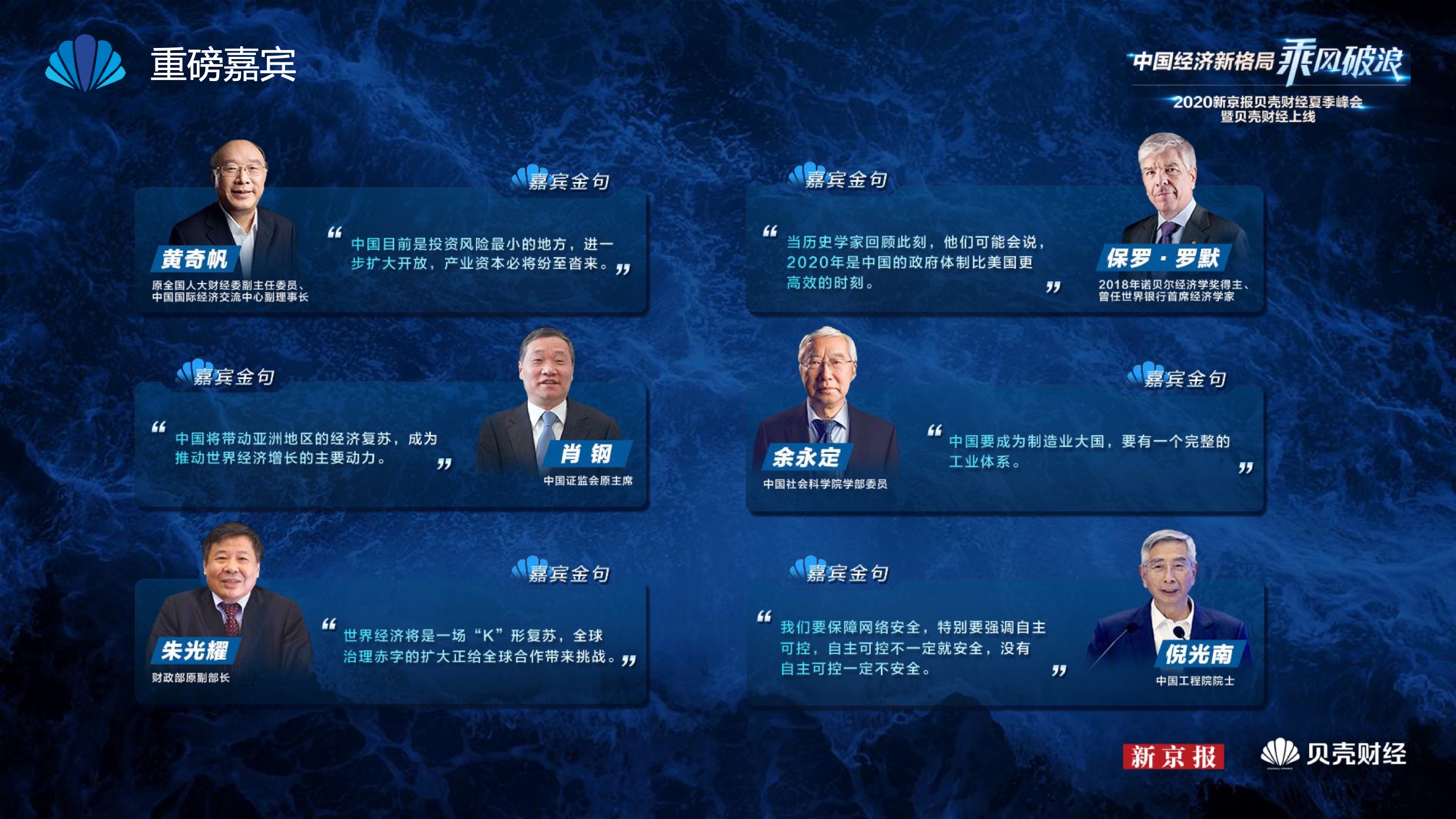 2020年8月6日-8月12日,2020新京报贝壳财经夏季峰会暨贝壳财经上线活动举行,本次峰会的主题为“中国经济新格局:乘风破浪”。7天12场高规格对话中,近50位专家大咖围绕疫后全球经济的走向、国内国际双循环格局的建立、资本市场改革、产业经济变革、女性力量等话题进行多元探讨,5个微博话题阅读量超千万、1个微博话题阅读量超亿,5个话题上热搜。