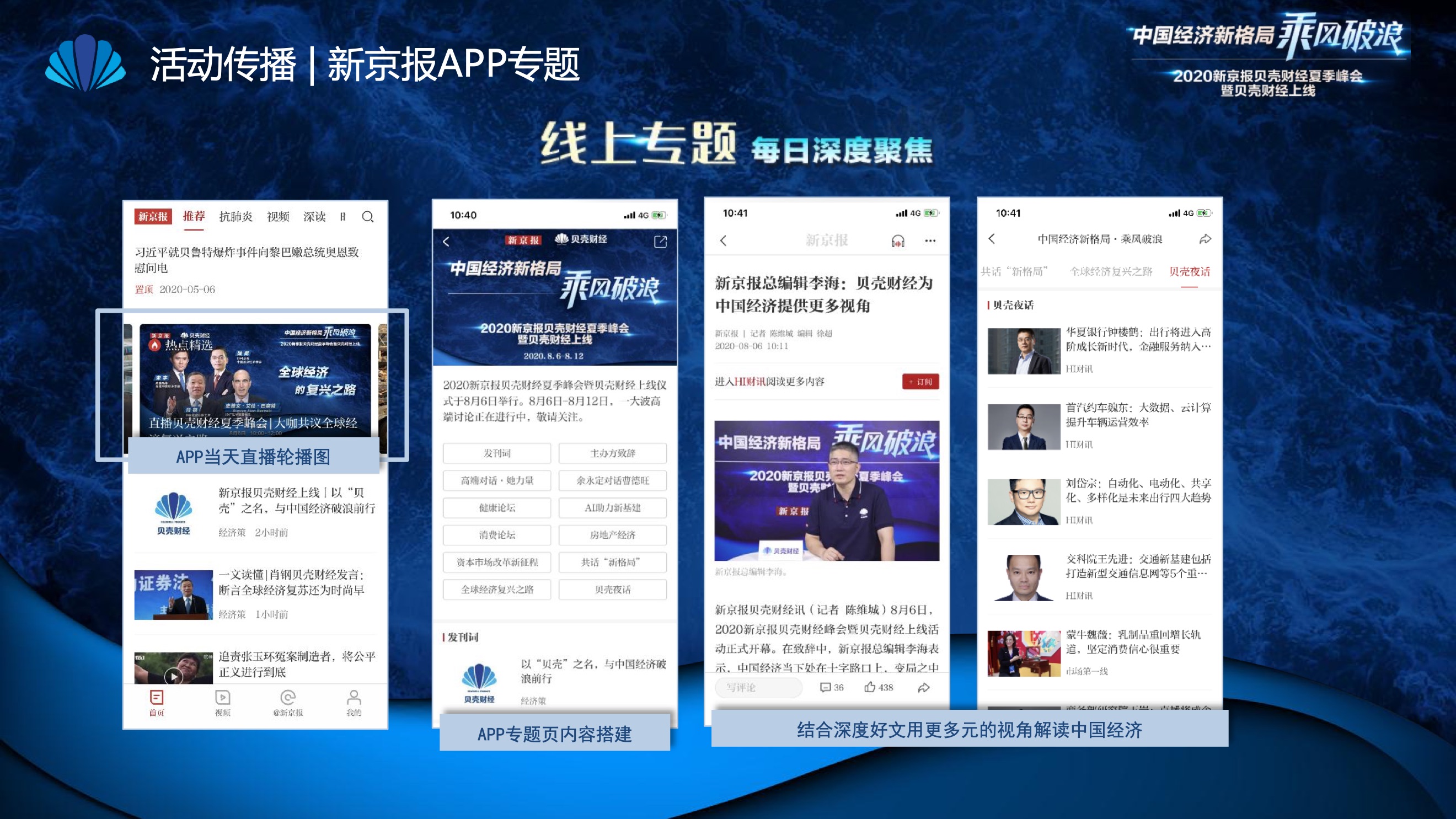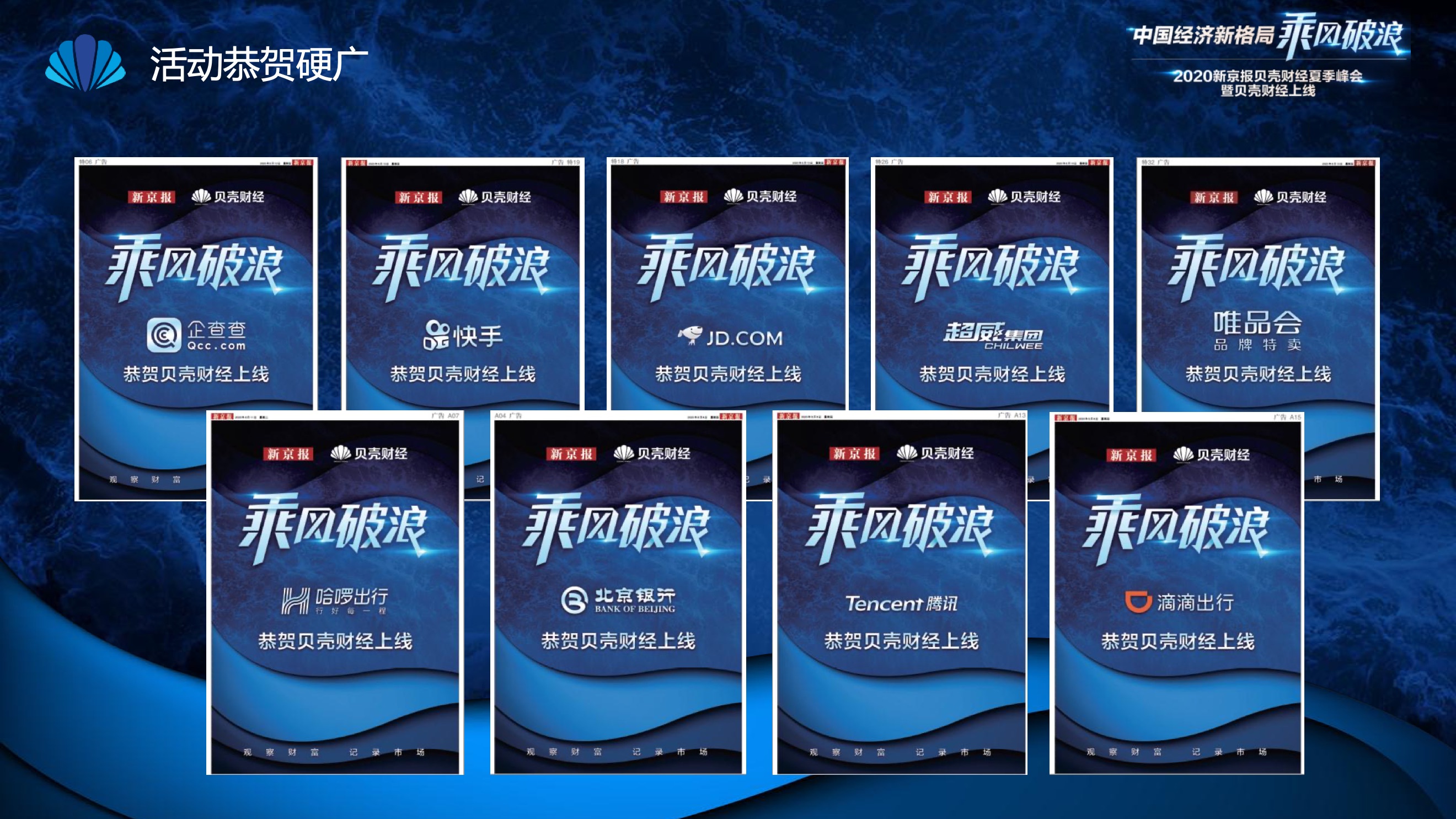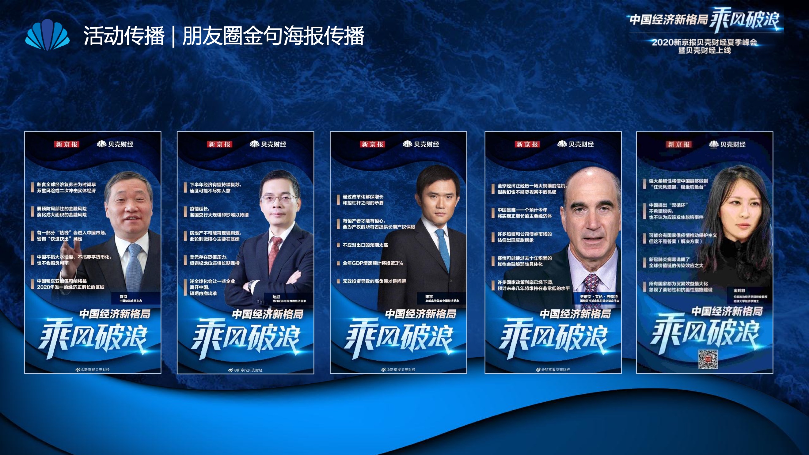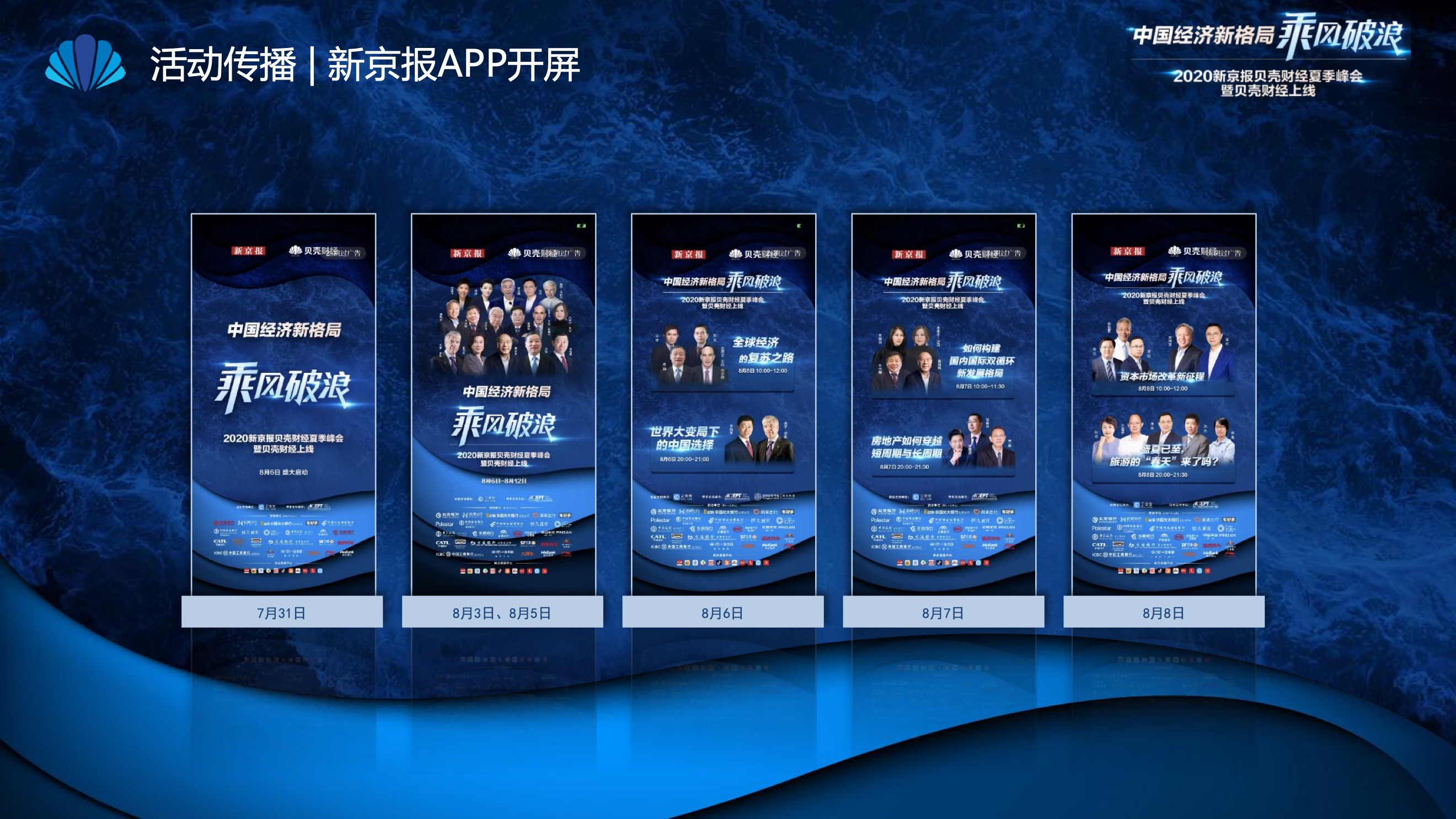 2020年8月6日-8月12日,2020新京报贝壳财经夏季峰会暨贝壳财经上线活动举行,本次峰会的主题为“中国经济新格局:乘风破浪”。7天12场高规格对话中,近50位专家大咖围绕疫后全球经济的走向、国内国际双循环格局的建立、资本市场改革、产业经济变革、女性力量等话题进行多元探讨,5个微博话题阅读量超千万、1个微博话题阅读量超亿,5个话题上热搜。