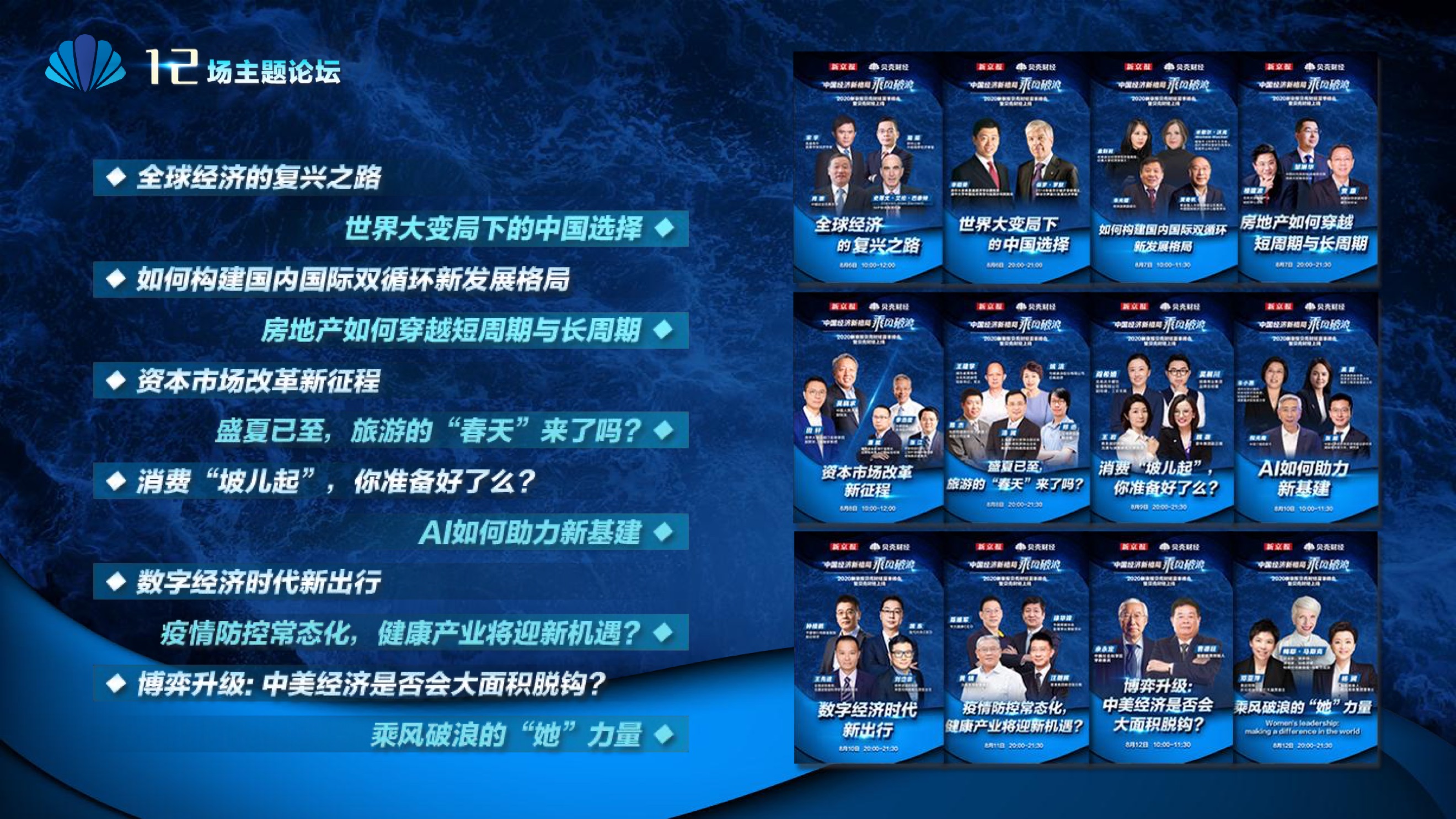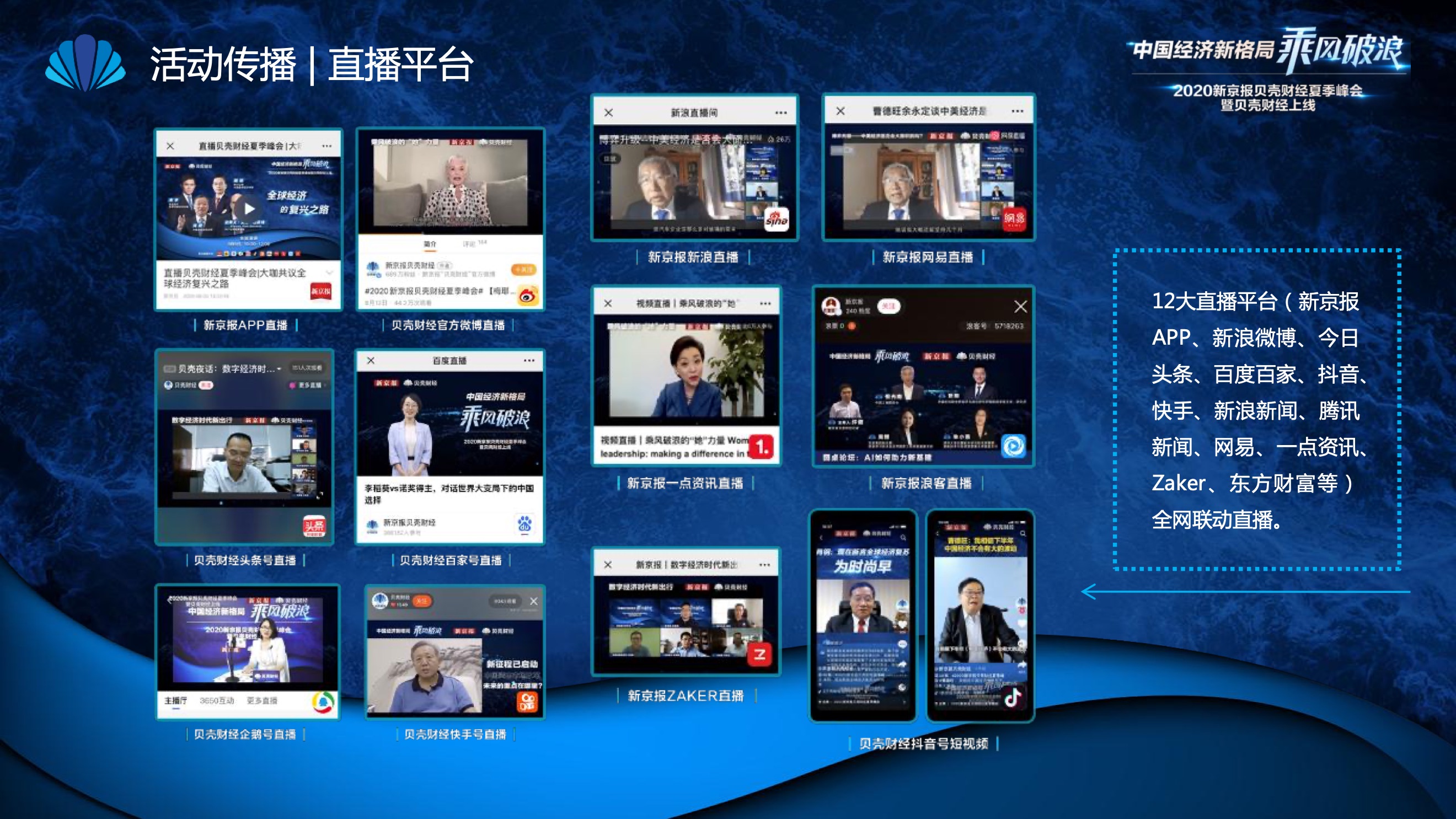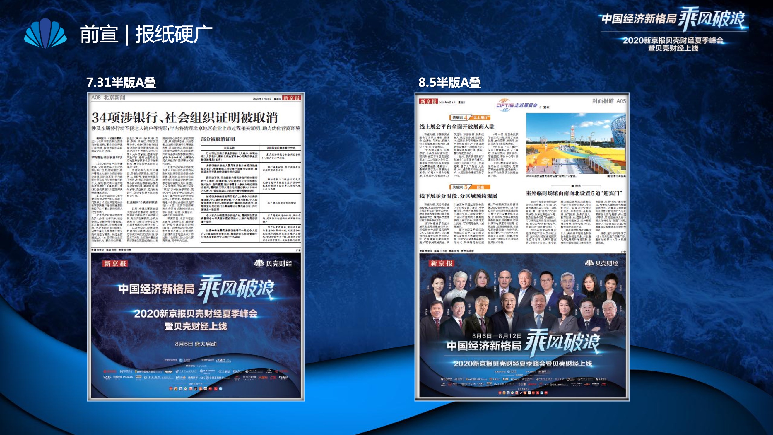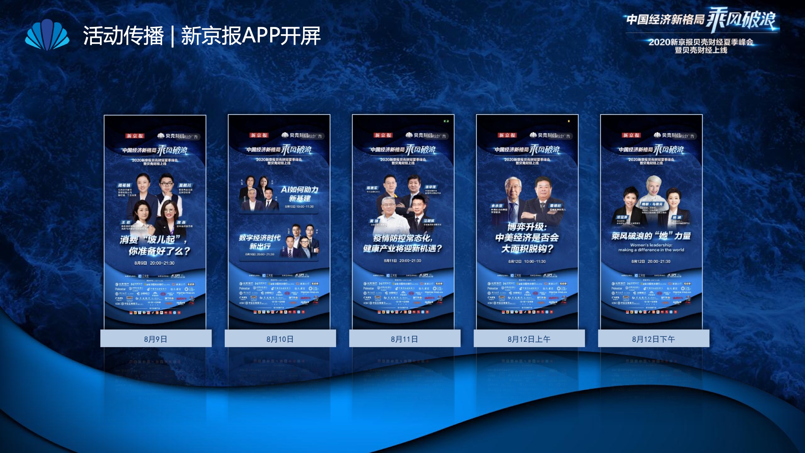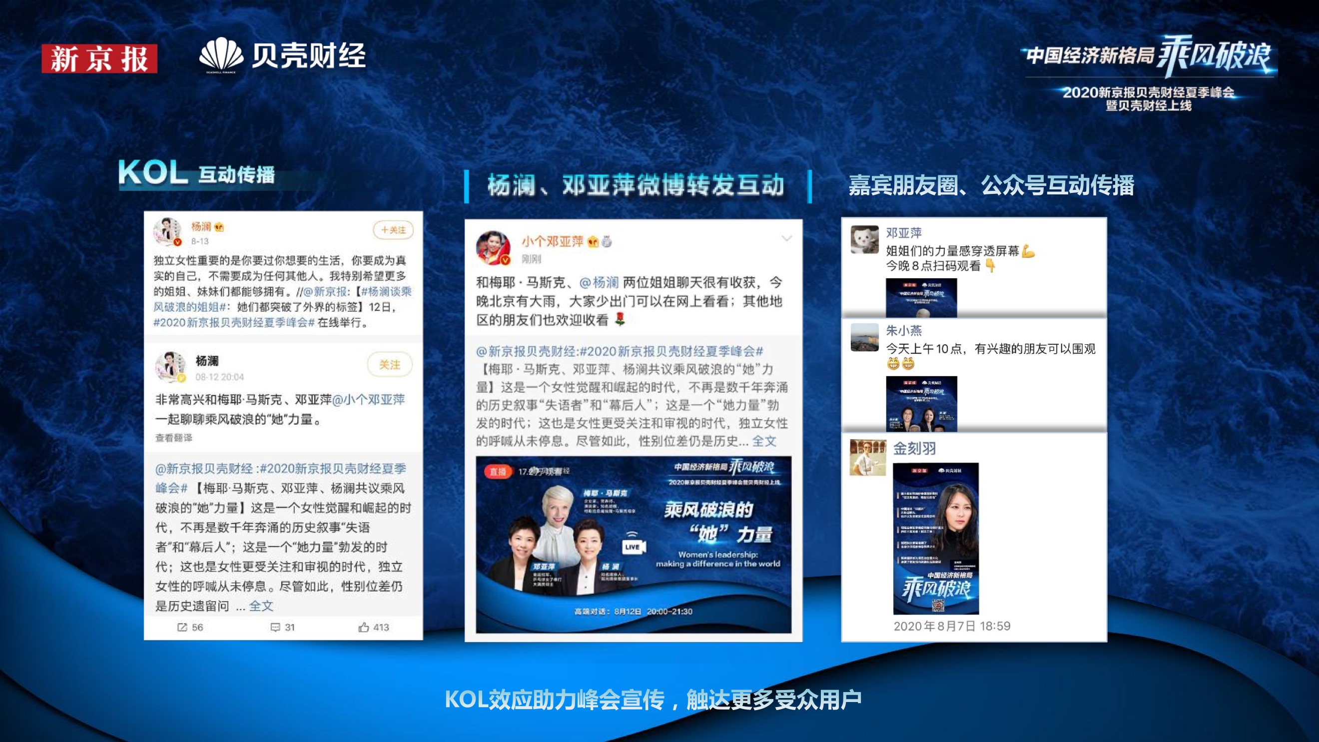 2020年8月6日-8月12日,2020新京报贝壳财经夏季峰会暨贝壳财经上线活动举行,本次峰会的主题为“中国经济新格局:乘风破浪”。7天12场高规格对话中,近50位专家大咖围绕疫后全球经济的走向、国内国际双循环格局的建立、资本市场改革、产业经济变革、女性力量等话题进行多元探讨,5个微博话题阅读量超千万、1个微博话题阅读量超亿,5个话题上热搜。