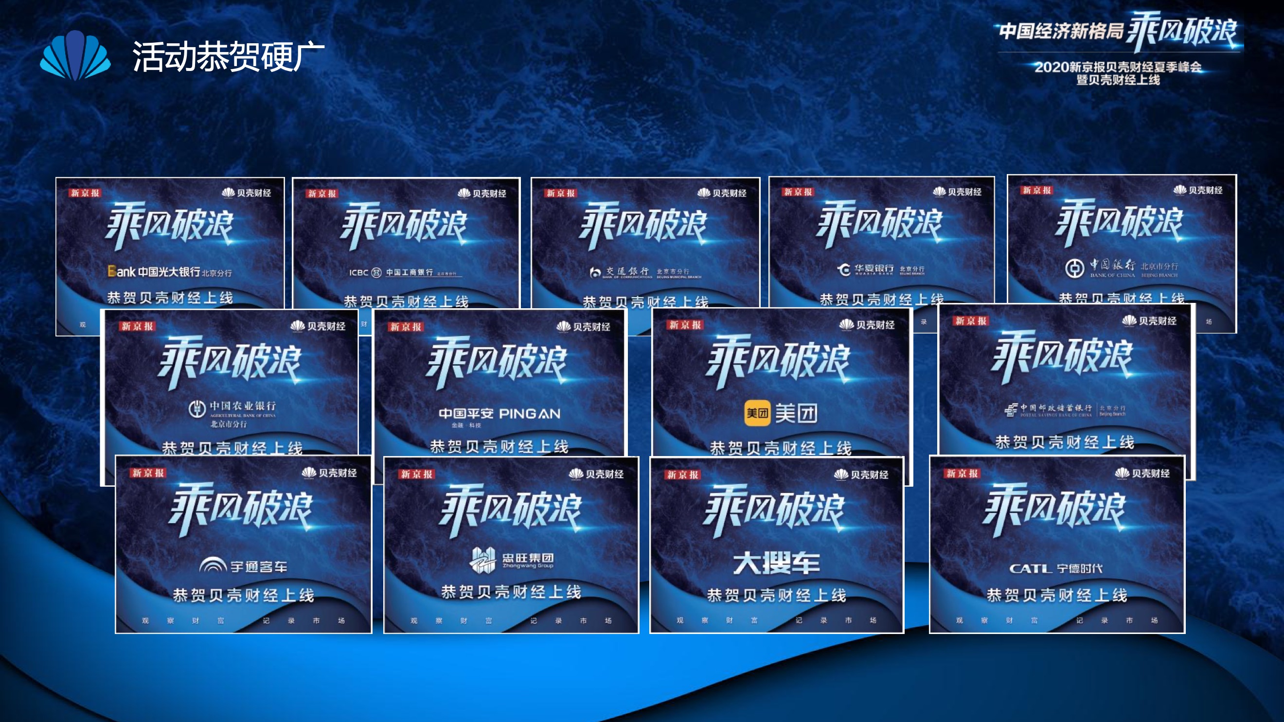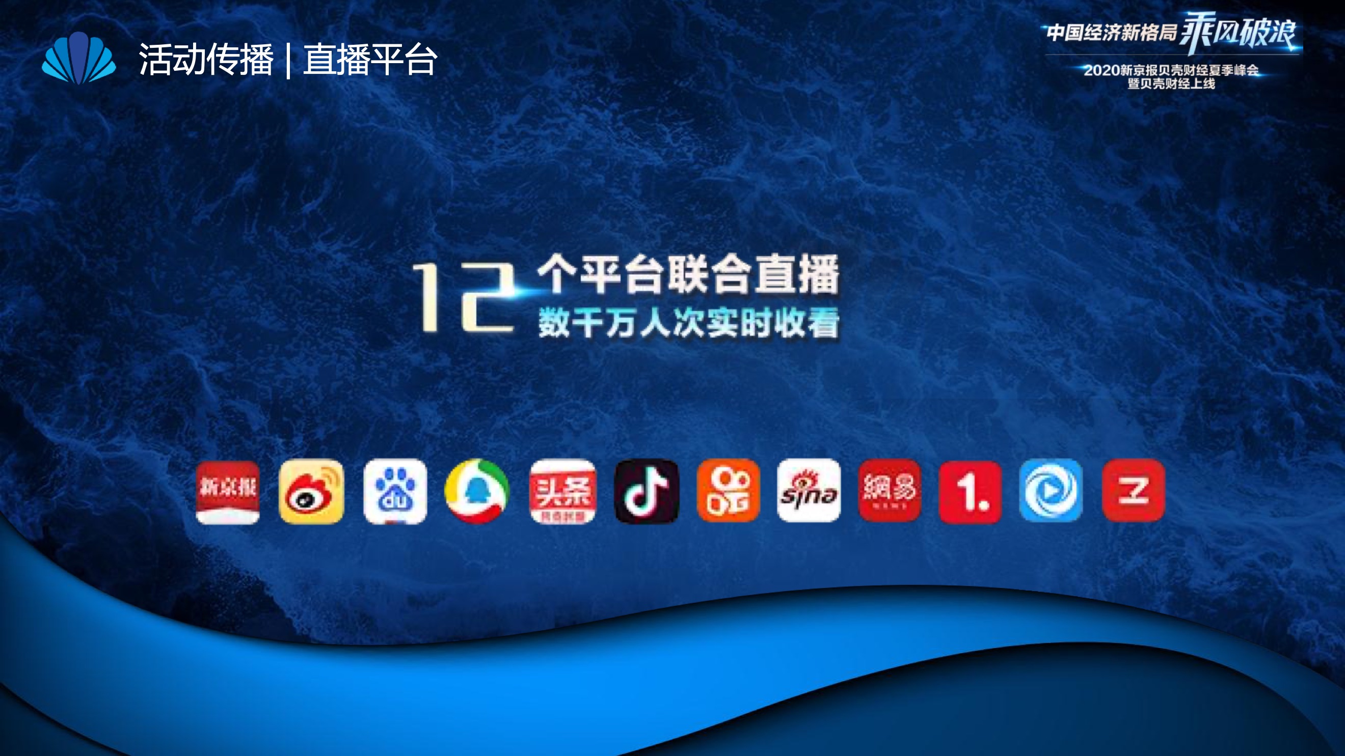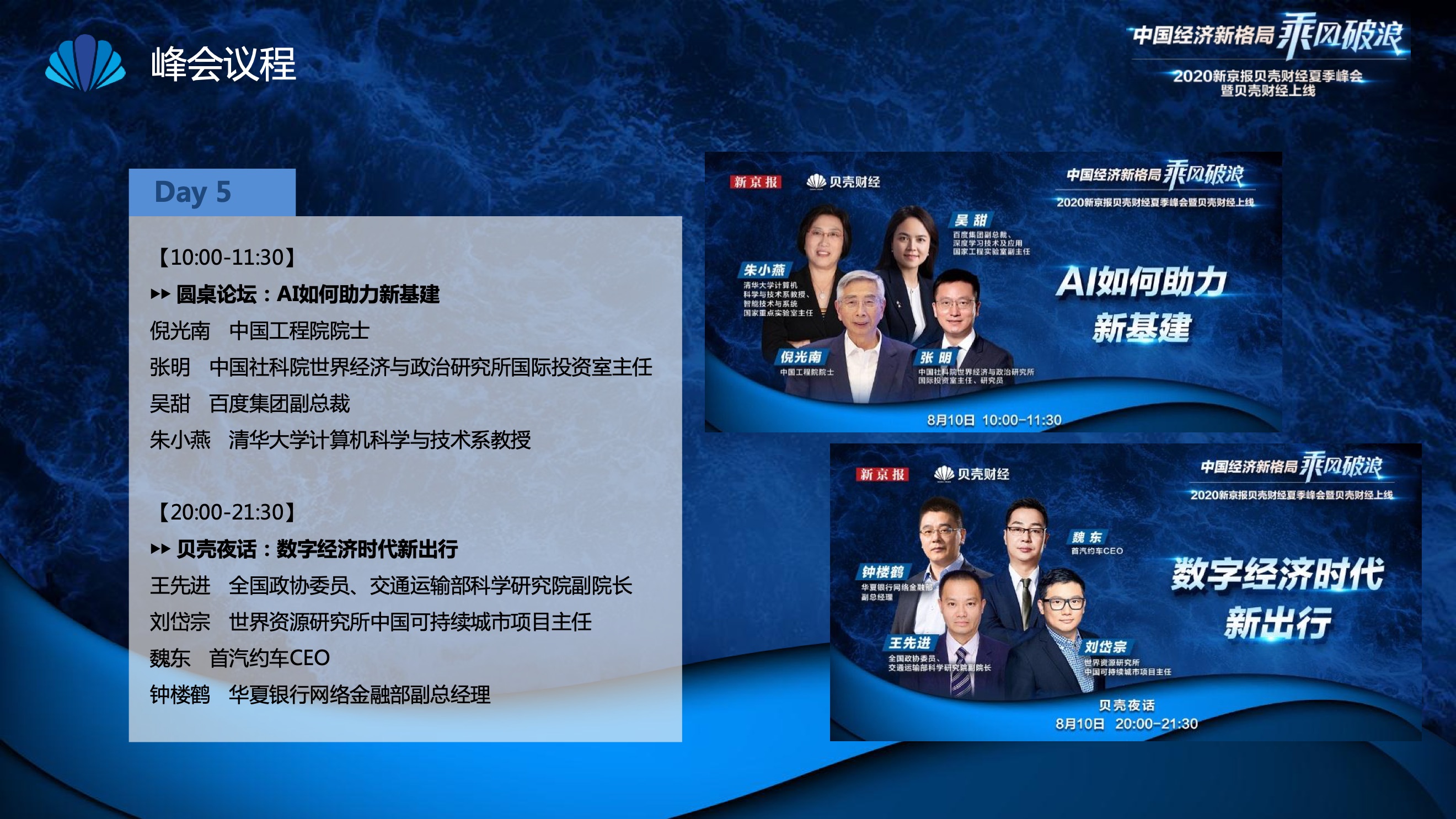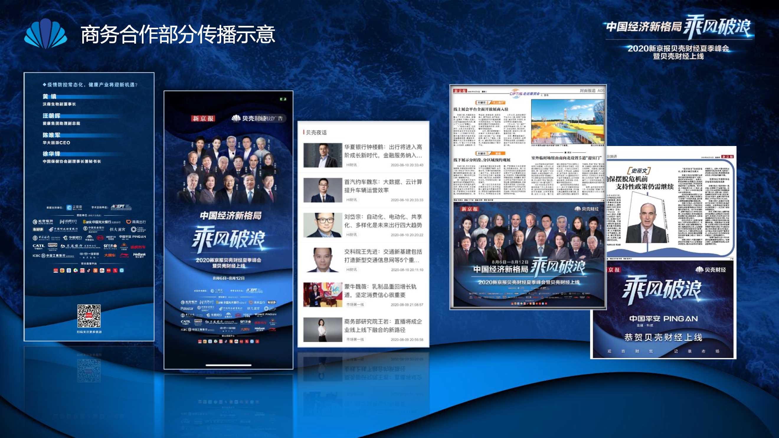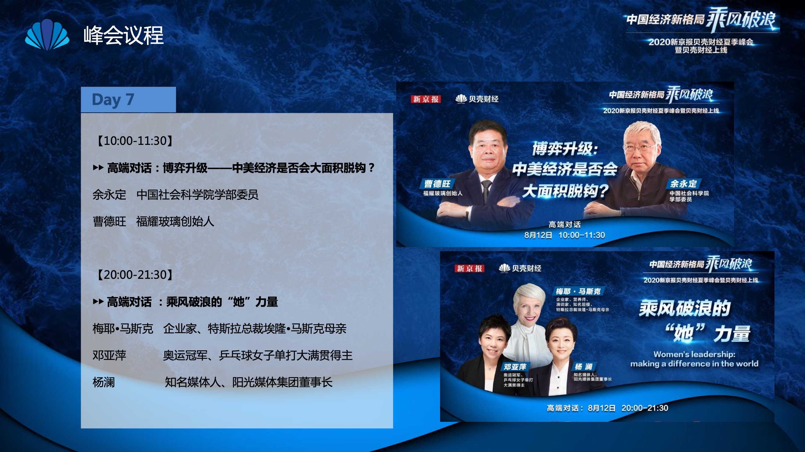 2020年8月6日-8月12日,2020新京报贝壳财经夏季峰会暨贝壳财经上线活动举行,本次峰会的主题为“中国经济新格局:乘风破浪”。7天12场高规格对话中,近50位专家大咖围绕疫后全球经济的走向、国内国际双循环格局的建立、资本市场改革、产业经济变革、女性力量等话题进行多元探讨,5个微博话题阅读量超千万、1个微博话题阅读量超亿,5个话题上热搜。