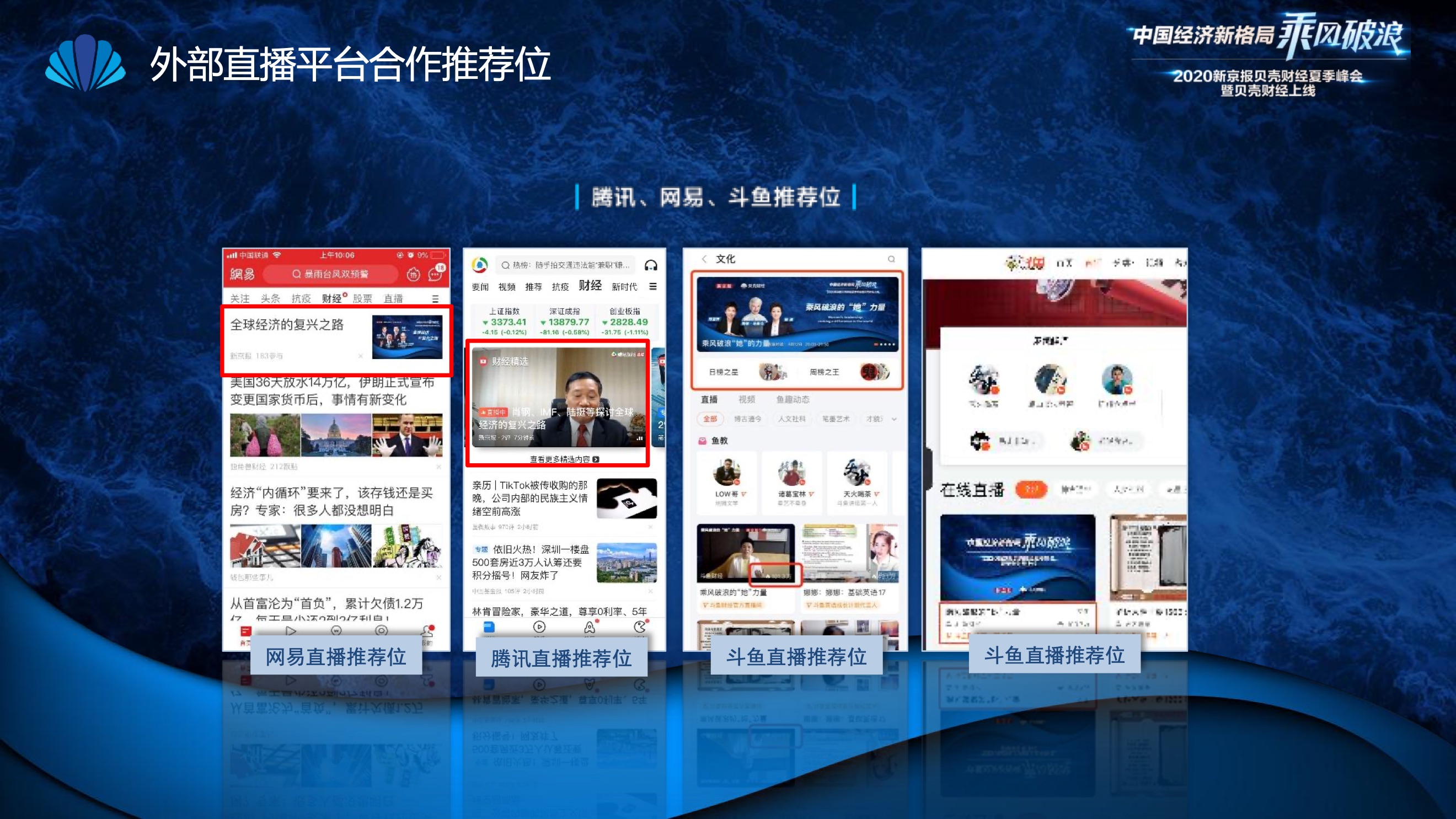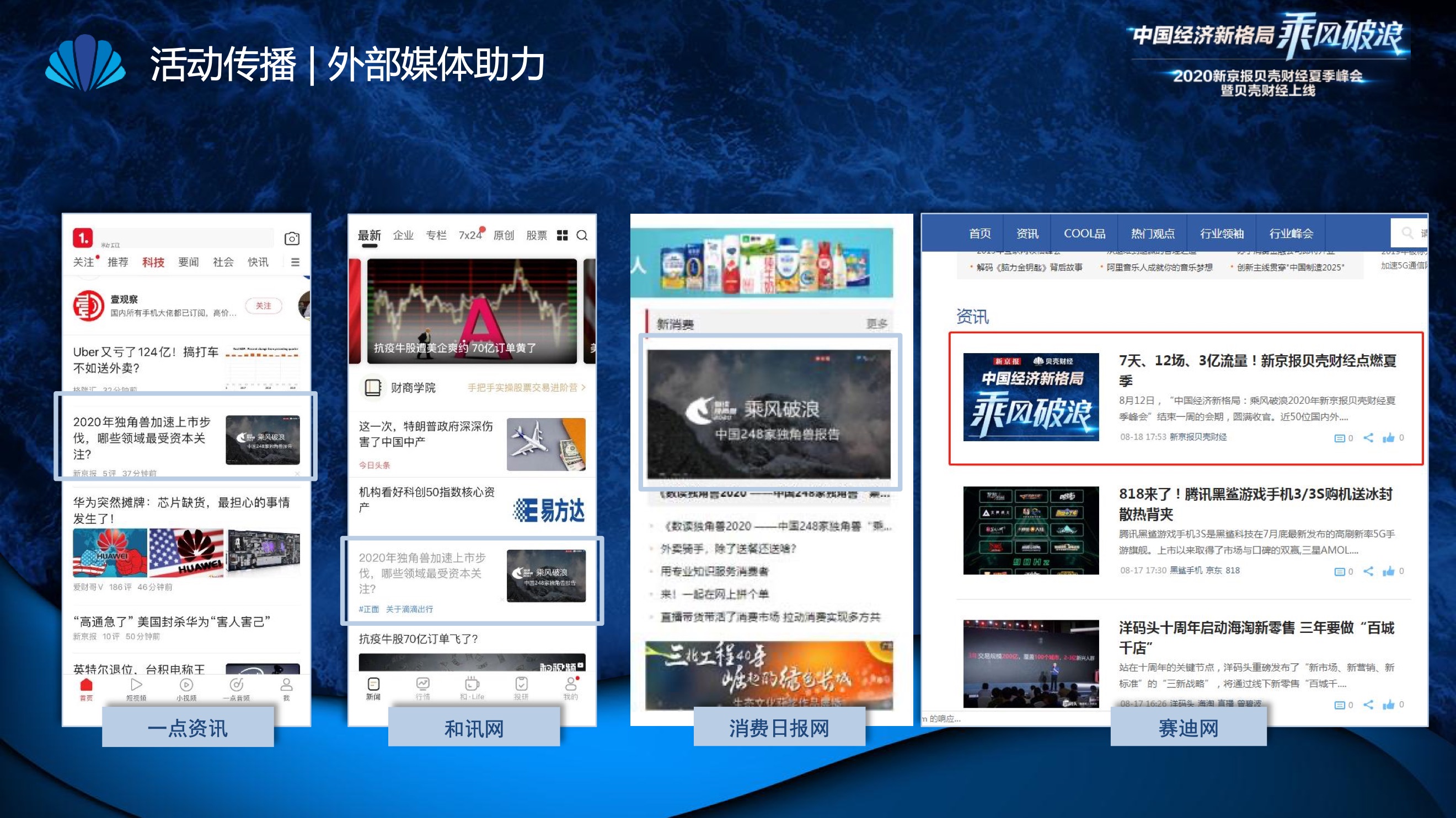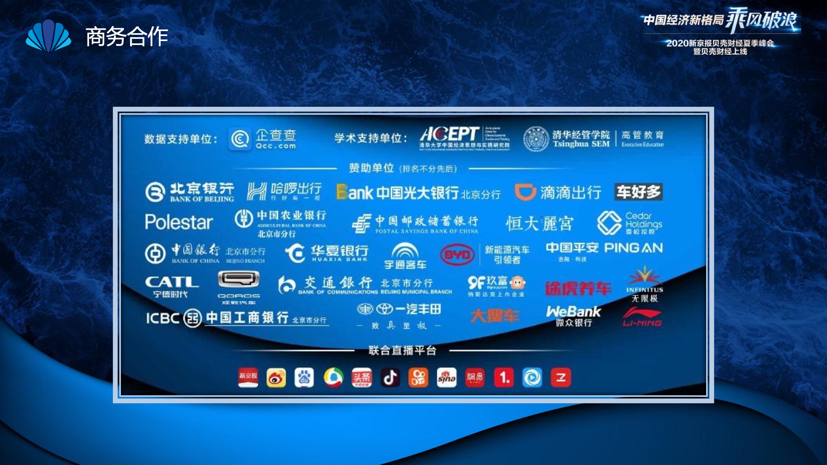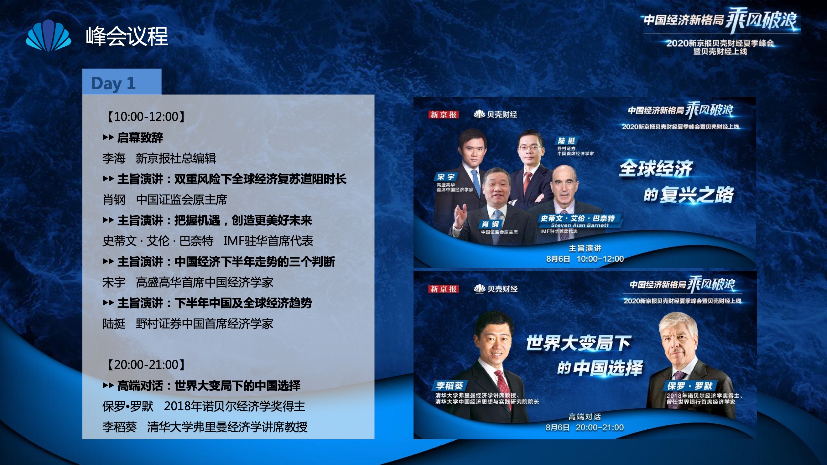 2020年8月6日-8月12日,2020新京报贝壳财经夏季峰会暨贝壳财经上线活动举行,本次峰会的主题为“中国经济新格局:乘风破浪”。7天12场高规格对话中,近50位专家大咖围绕疫后全球经济的走向、国内国际双循环格局的建立、资本市场改革、产业经济变革、女性力量等话题进行多元探讨,5个微博话题阅读量超千万、1个微博话题阅读量超亿,5个话题上热搜。