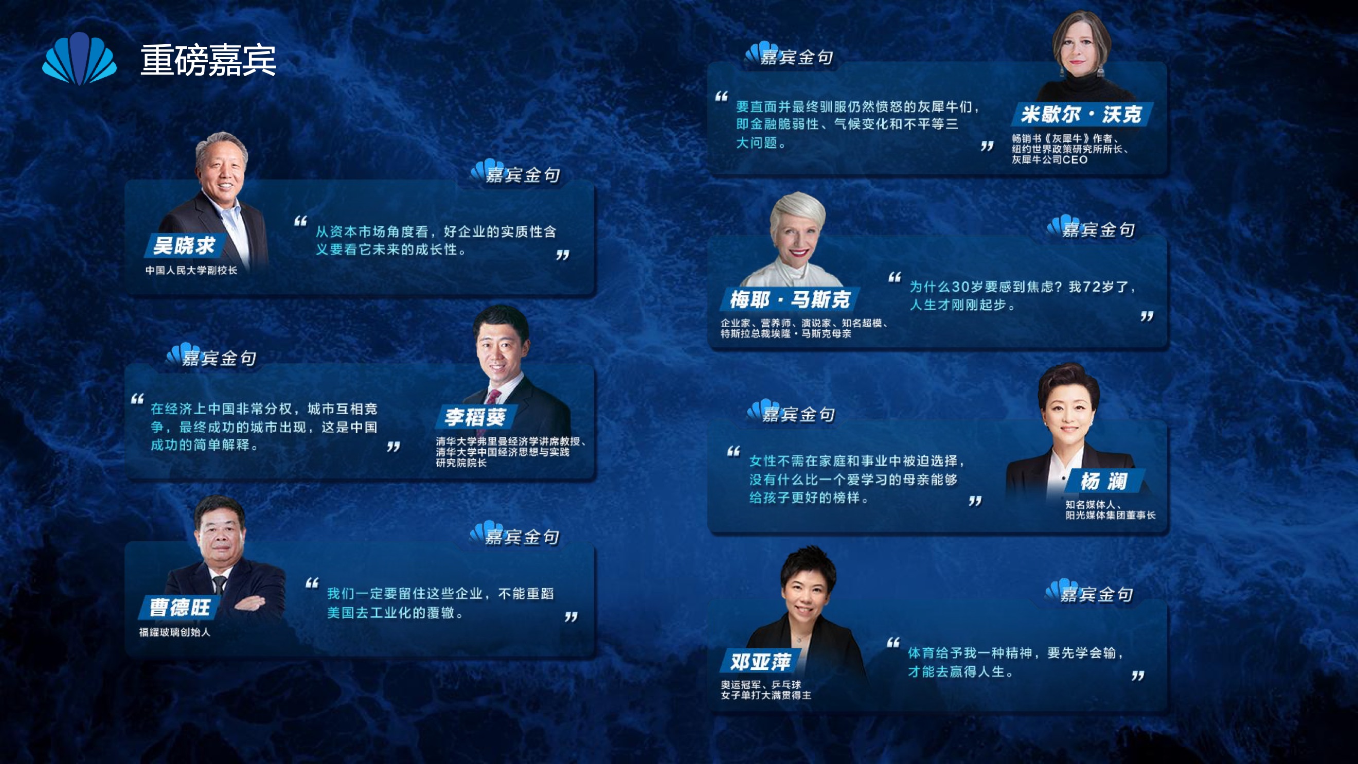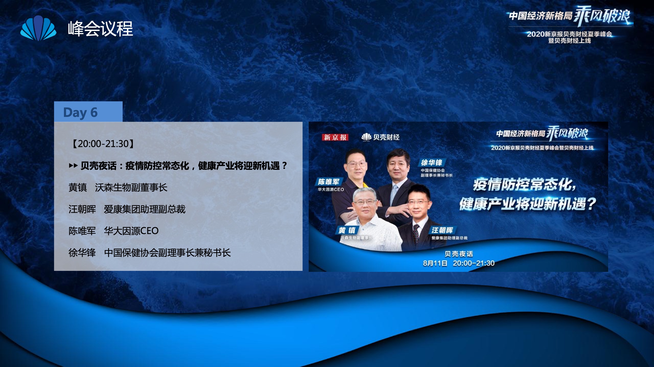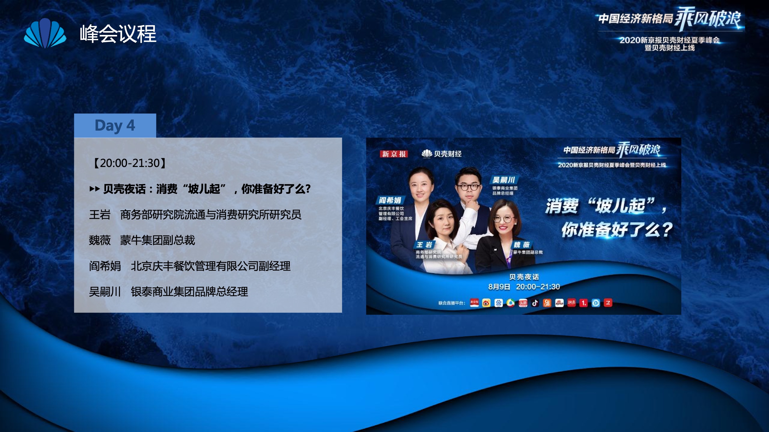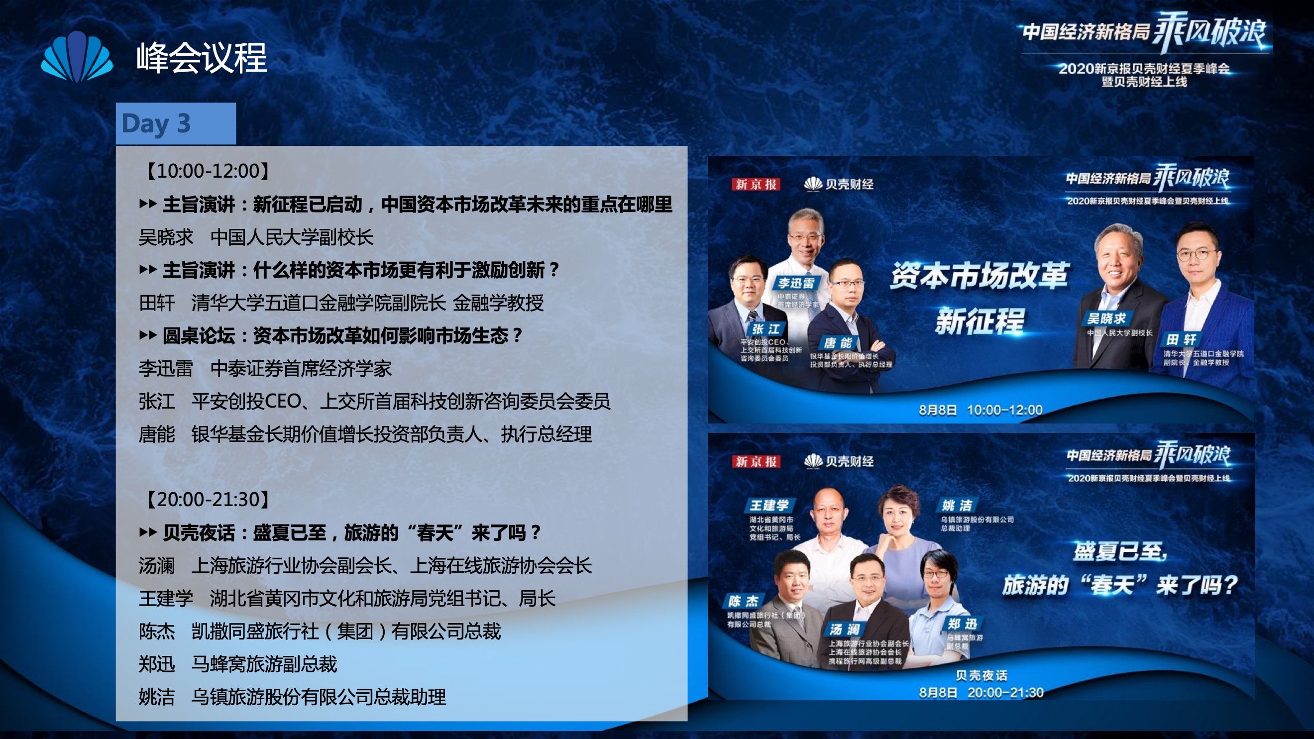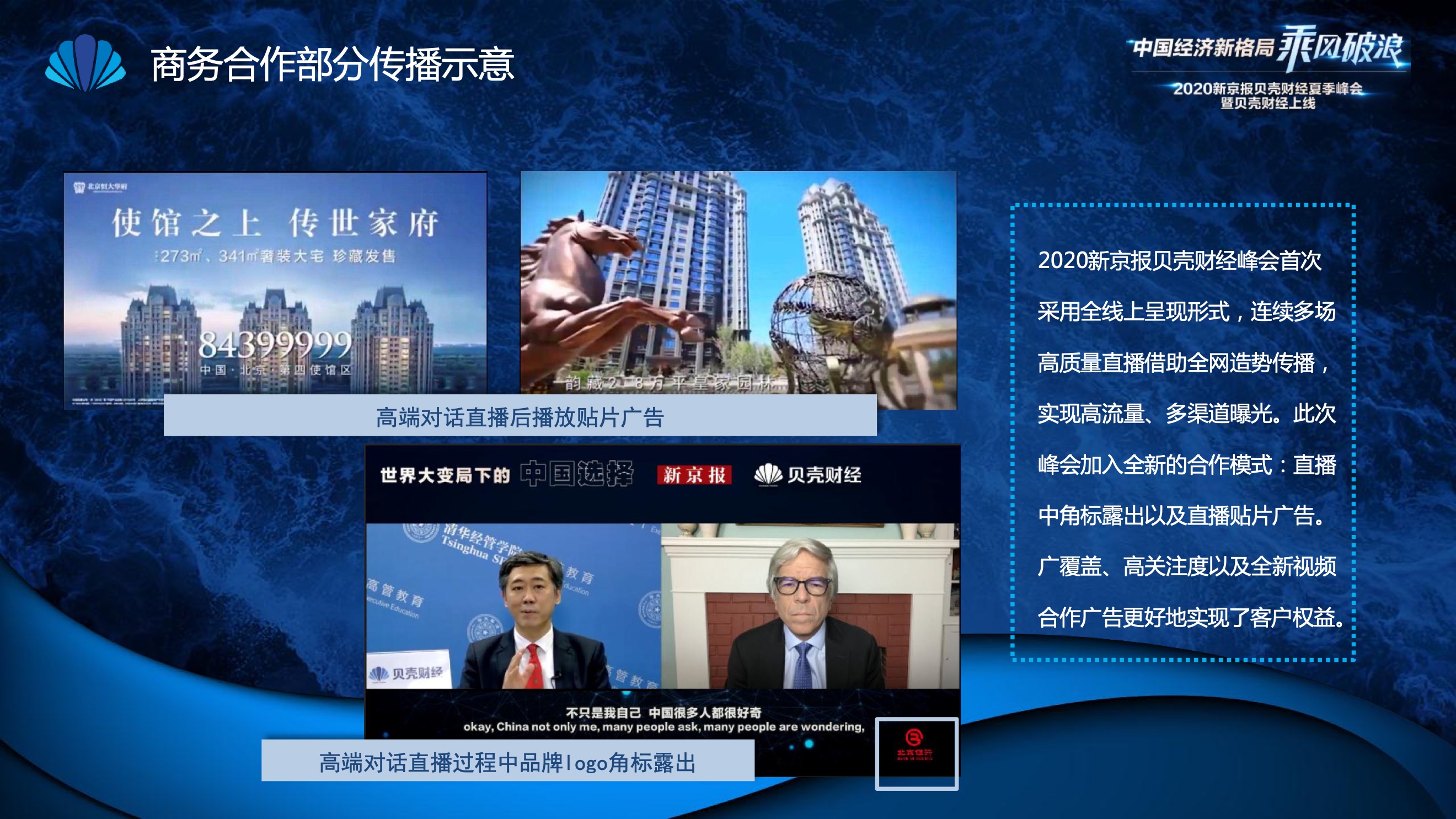 2020年8月6日-8月12日,2020新京报贝壳财经夏季峰会暨贝壳财经上线活动举行,本次峰会的主题为“中国经济新格局:乘风破浪”。7天12场高规格对话中,近50位专家大咖围绕疫后全球经济的走向、国内国际双循环格局的建立、资本市场改革、产业经济变革、女性力量等话题进行多元探讨,5个微博话题阅读量超千万、1个微博话题阅读量超亿,5个话题上热搜。
