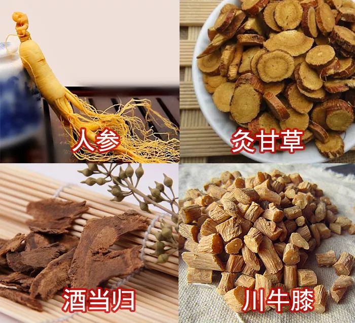人参、酒当归、灸甘草、川牛膝等