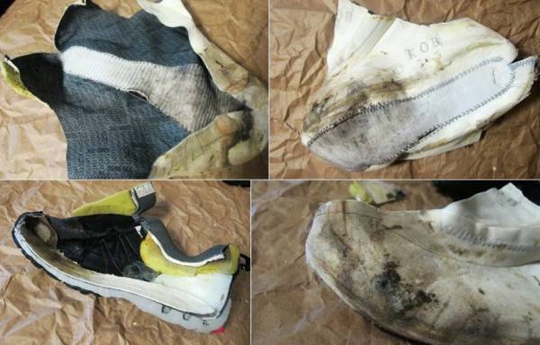 下面这组图片是我前些年将一双破损的越野跑鞋进行了解刨后取出防水袜套后的情景,其中黑色破洞就是穿着不当,让尖锐物刺穿了防水膜,使得鞋子失去了防水功能,贴出此图片的目的在于向大家提个醒,在穿着有防水袜套的户外鞋时,应避免尖锐物划伤和刺穿防水层,使户外鞋保持持久的防水性能。