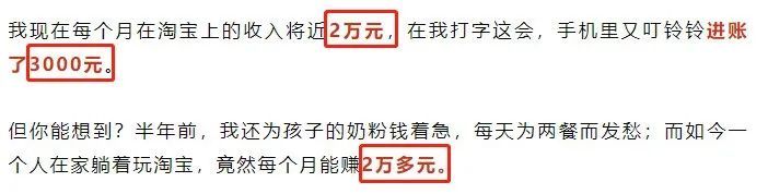 更重要的一点是:淘宝目前正迎来属于普通人创业的第二春,而且很多人还不知道!很多人都不知道,疫情之后,淘宝出台了政策条款,支持大家用淘宝创业增加收入。这就是淘宝新电商能成为2023年赚钱风口的原因之一!!!据专业调研机构数据显示,疫情期间淘宝用户数量激增,且远高于其他电商平台,淘宝的订单已经多到供不应求。可以这样说:现在做淘宝新电商,你根本不用担心没流量,要担心的是订单做不做得过来,钱数不数得过来!在流量=金钱的今天,淘宝可以说是遍地黄金,而且多到硌脚的程度了!毫不夸张地说:未来5年,普通人最容易赚钱的项目一定是淘宝新电商模式!当你还在为钱苦恼时,为了那微薄的“死工资”而劳心劳力时。很多打工人、大学生、宝妈,已经利用业余时间去搞淘宝新电商模式,赚取了丰厚的“第二收入”,实现了财务自由,过上了有钱又有闲的自由生活!只要有空闲时间的都可以尝试一下,反正也无门槛,几乎无成本,也不会有压货产生,想赚钱的真的可以试试~