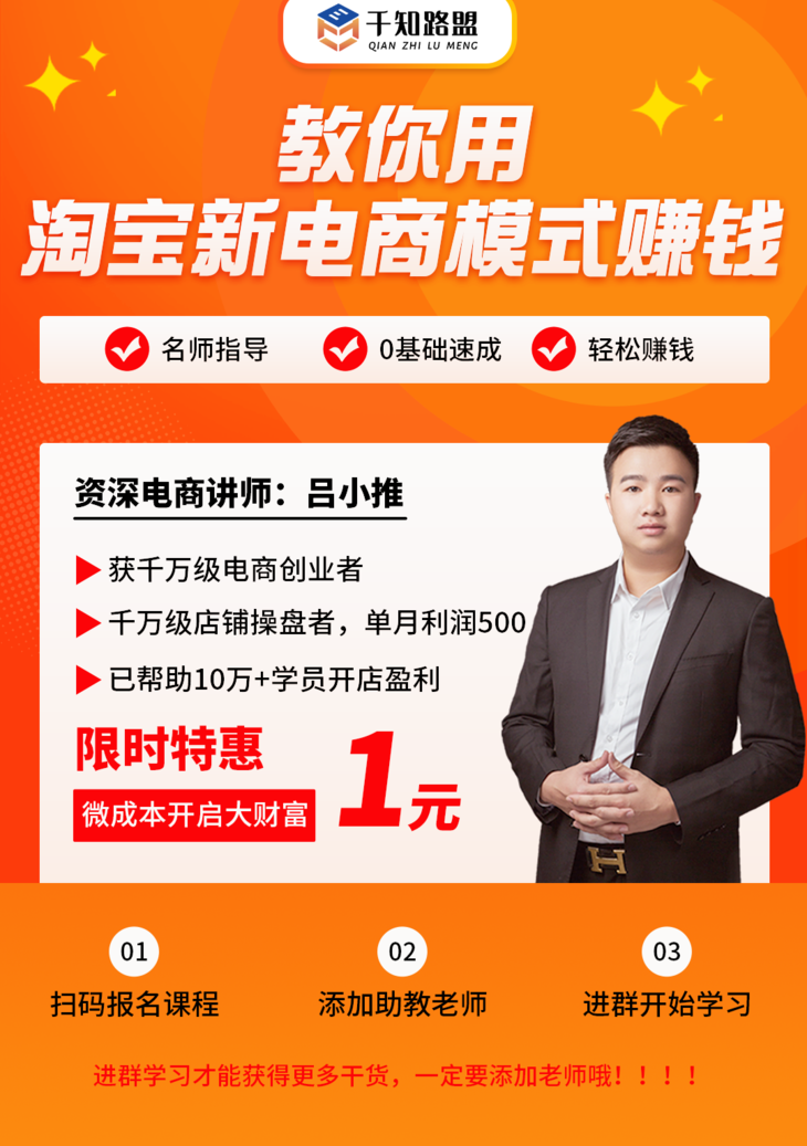 还是用完全合法的方式,操作简单,时间自由,成本还低,用点心一个月收入没有五位数你可以来揍我。逛了那么多年淘宝才知道淘宝还能这么赚钱,感觉自己痛失了一笔巨额财富!我用自己的亲身经历证明:淘宝新电商模式特别适合我们普通人,而且实实在在能赚到钱的,零基础小白也能月入过万。作为普通人,你可能赚不了几百万,但你完全可以利用业余时间,开新电商店铺卖卖货,赚赚差价,月入上万不是问题!现在,我把带我从“负人”蜕变成“富人”的「淘宝新电商赚钱训练营」推荐给你!请立即长按下方二维码,开始学习,将来的你一定会感激今天努力的自己!为了帮助更多的朋友,今天在本公众号报名学习,原价199元的课程,前 200 人享受1元报名,相当于免费!大家用空余时间打游戏看剧看小说,我用空余时间用淘宝新电商偷偷赚钱,还有比这更美滋滋的事情吗!不管是不方便出门的宝爸宝妈,还是在校的大学生,还是辛苦在外奔波想靠副业增加点收入的社畜打工人,都可以来淘宝新电商试试,搞不好就单车变宝马咯!