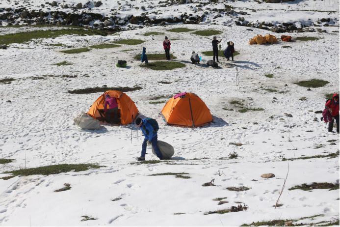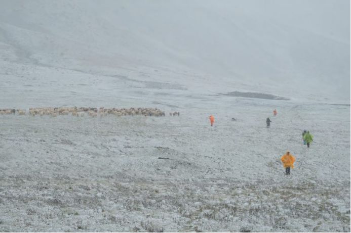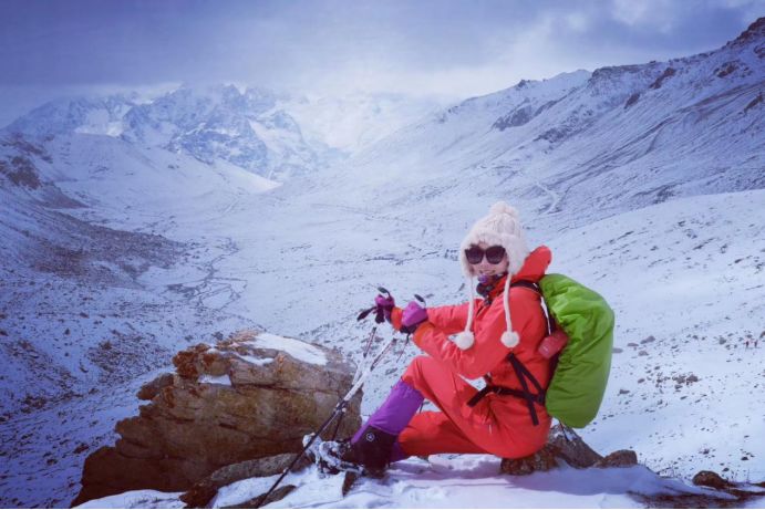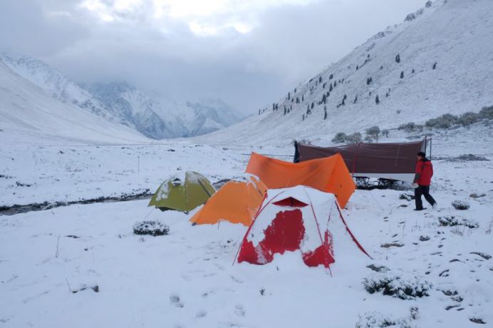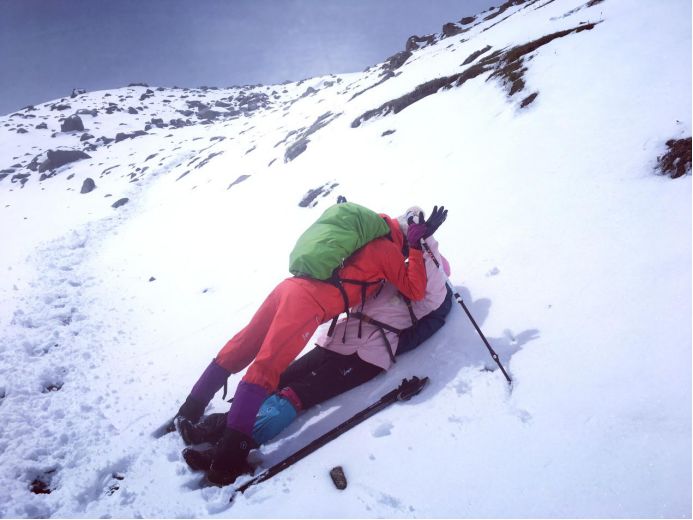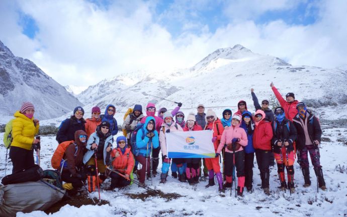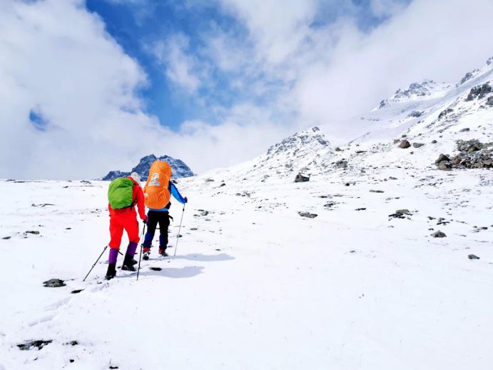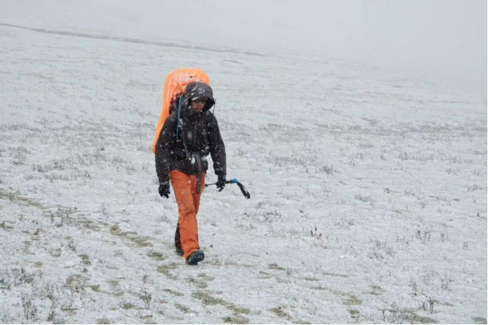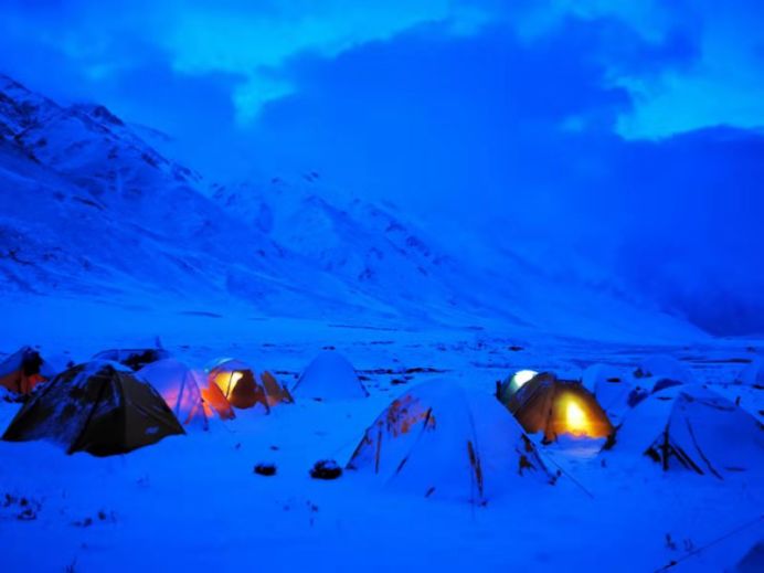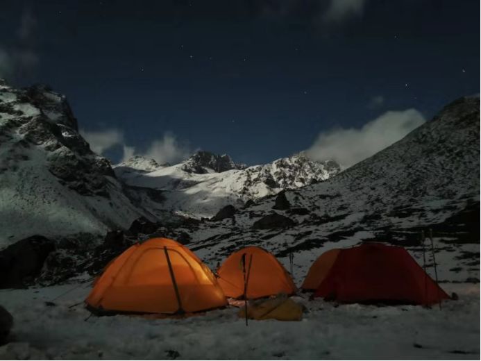 天幕都压塌了,幸好帐篷很结实,拉开睡袋拉链,雪旋即蹿进来,昨晚的雪有些大。一大早,上海的小哥升起了他的无人机航拍,各队友也是龇牙咧嘴的各种凹造型。