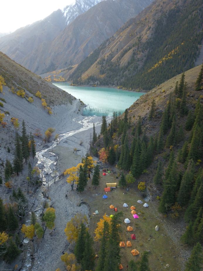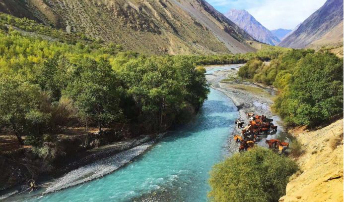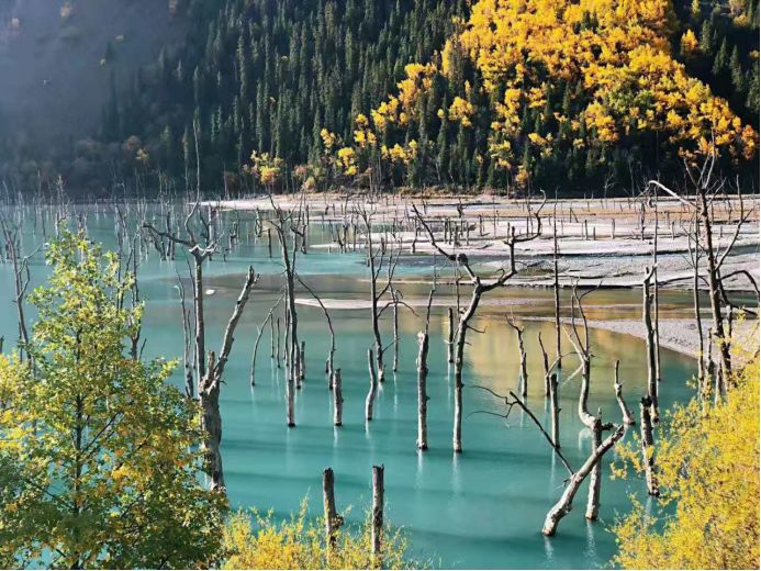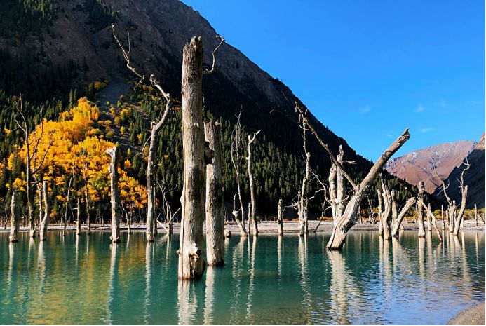 沿河逆流而行,遇到秋季转场的牛羊,牛羊肥壮,场面壮观,本不好走的碎石斜切路被这些生灵踩过,已经看不出模样。来到美得不可方物的天湖,湖水透出的蓝,层叠郁郁葱葱的山林,衬托着湖里的枯木都充满了力量。