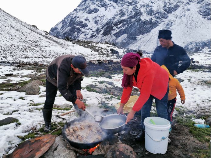 晚餐吃大锅炖羊肉,手抓饭,牧民的手艺很好,可是队友们缺的是战斗力,一只羊还有余。