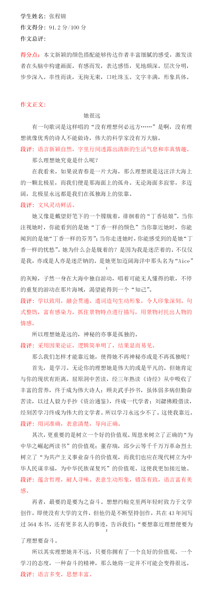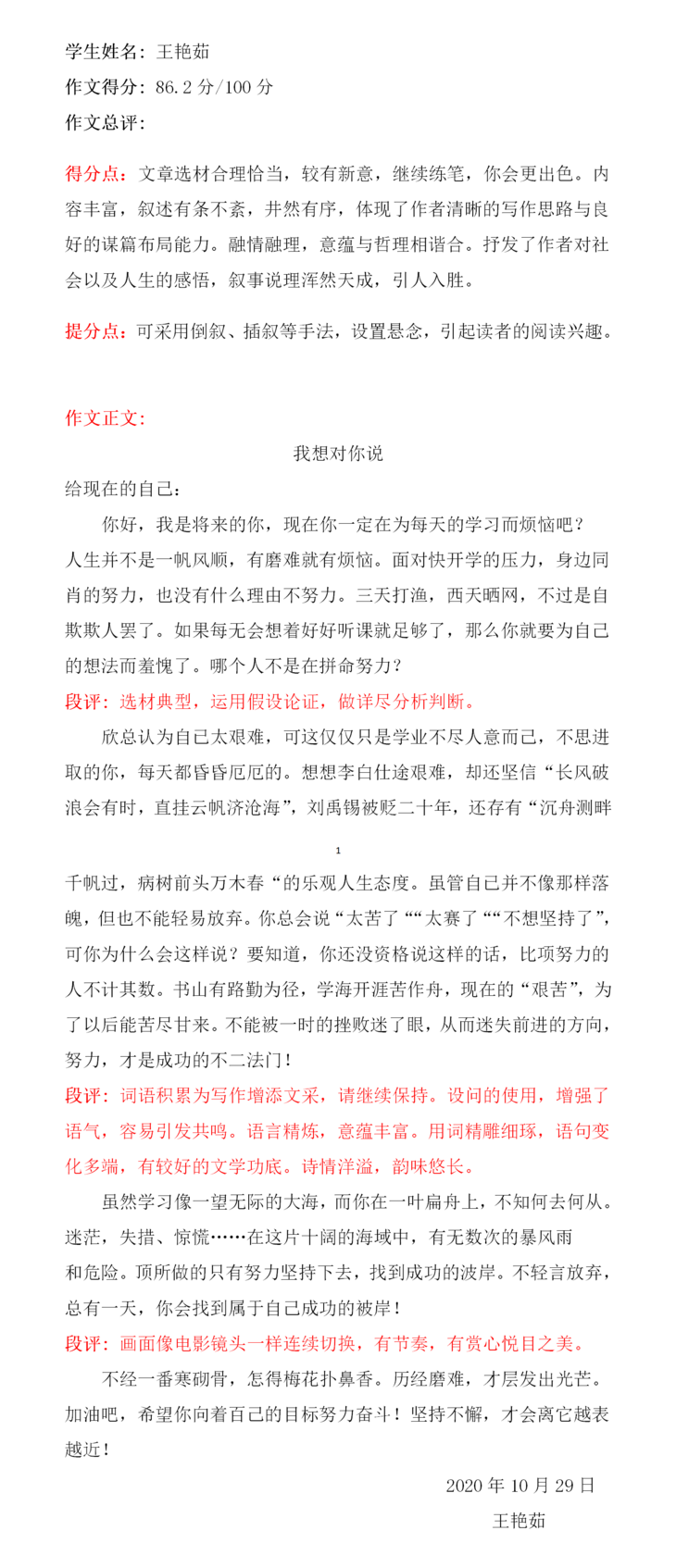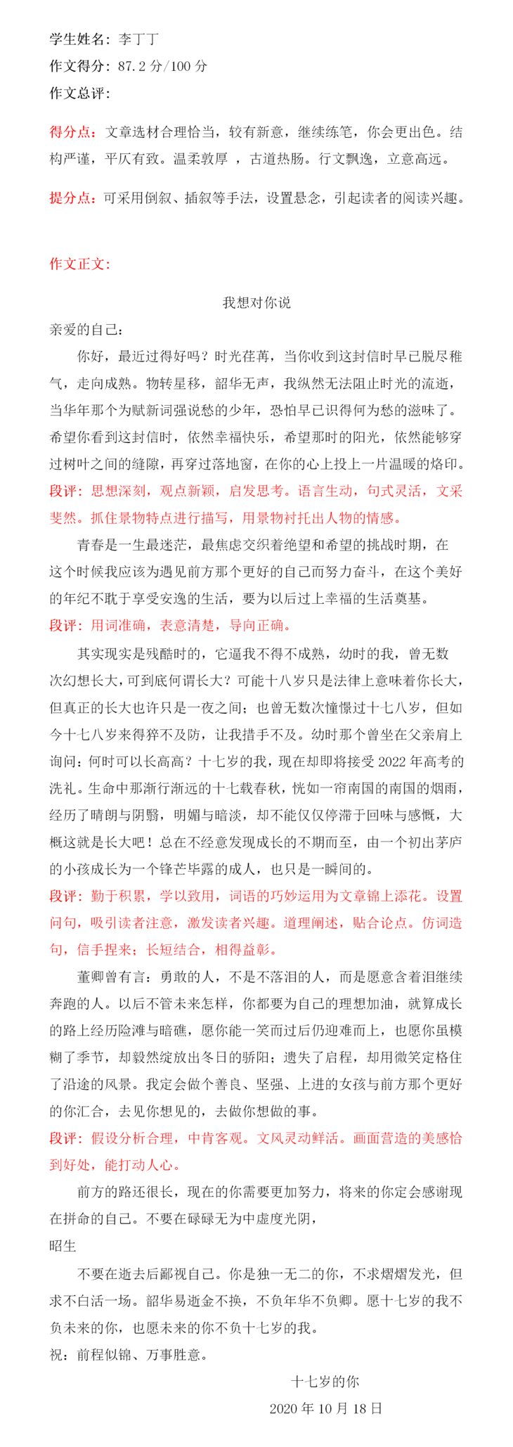 你是一个懂事、可爱、勤学好问的孩子,老师始终相信“没有比人更高的山,没有比脚更长的路,海到尽头天作岸,山高绝顶我峰”。你一定会是那匹冲出重围的黑马。明年六月等你金榜题名,加油!