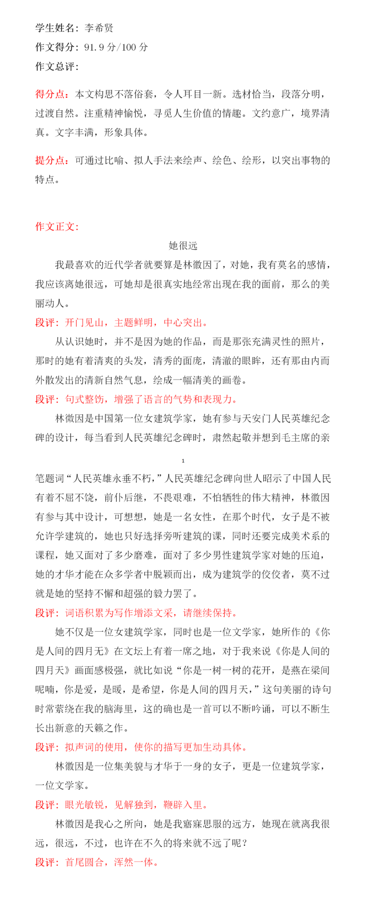 李希贤是一个爱读书的孩子,她由衷地喜欢林徽因,敬仰林徽因的才华和人品。于是她通过文字表达自己真挚的感情。感人心者莫先乎情,她的文字读来令人感动。