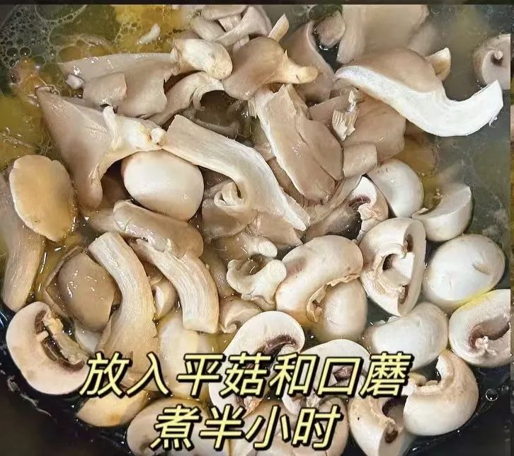 步骤二:放入口蘑和平菇(也可以放入自己喜欢的菌类),煮半小时。