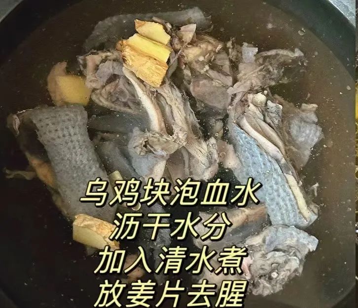 步骤一:乌鸡切块,清水泡血水,沥干水分,加入清水煮半小时。