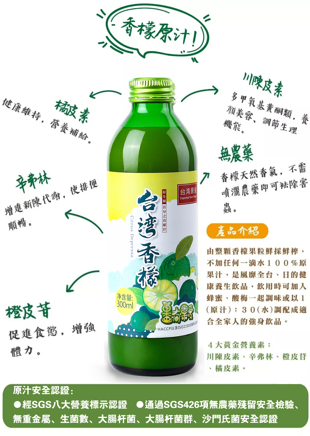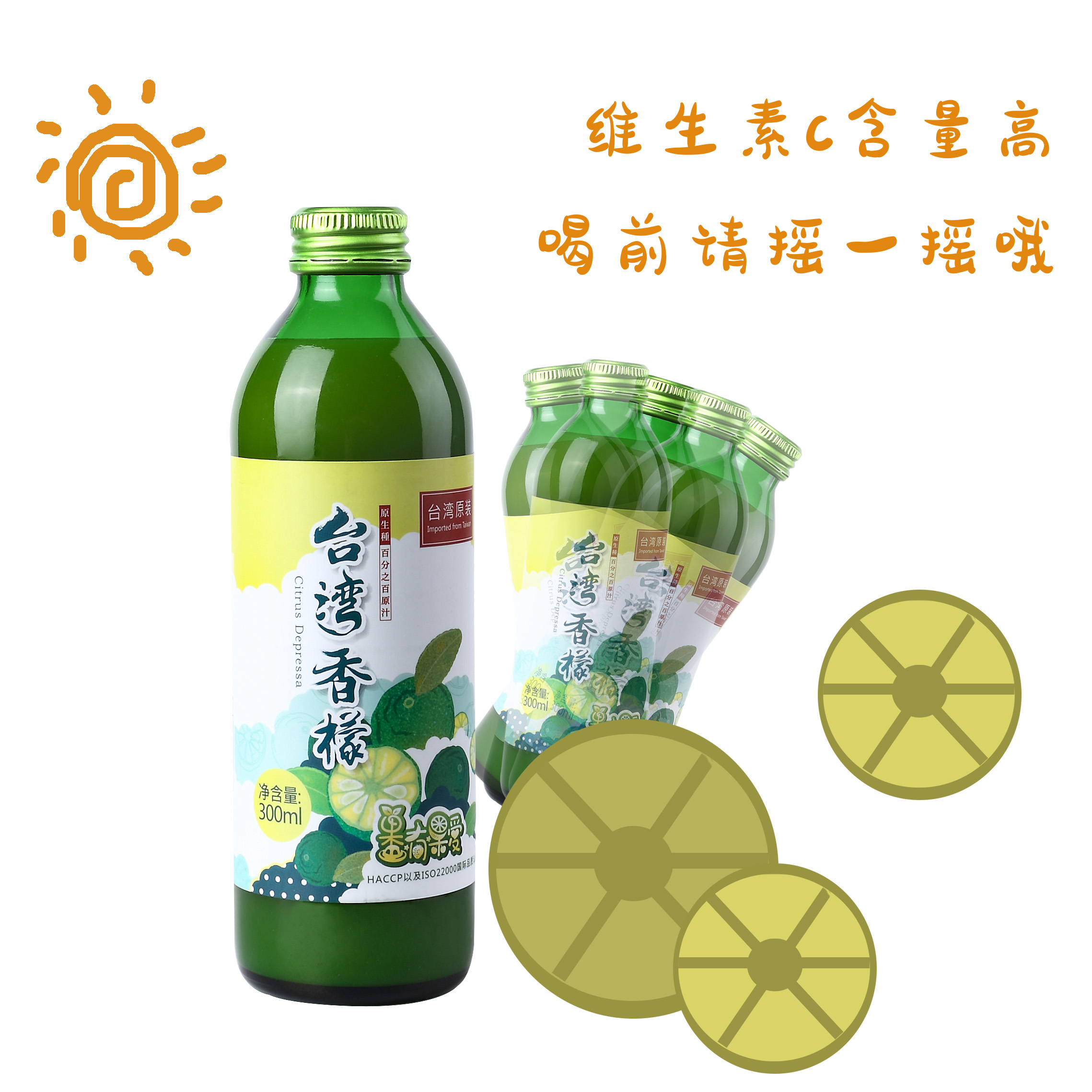 100%连皮带肉整颗鲜榨而成的香檬原汁,将新鲜原果清洗后压榨出果汁,经瞬间杀菌后直接罐装,不经过浓缩,保留水果原有的新鲜风味。