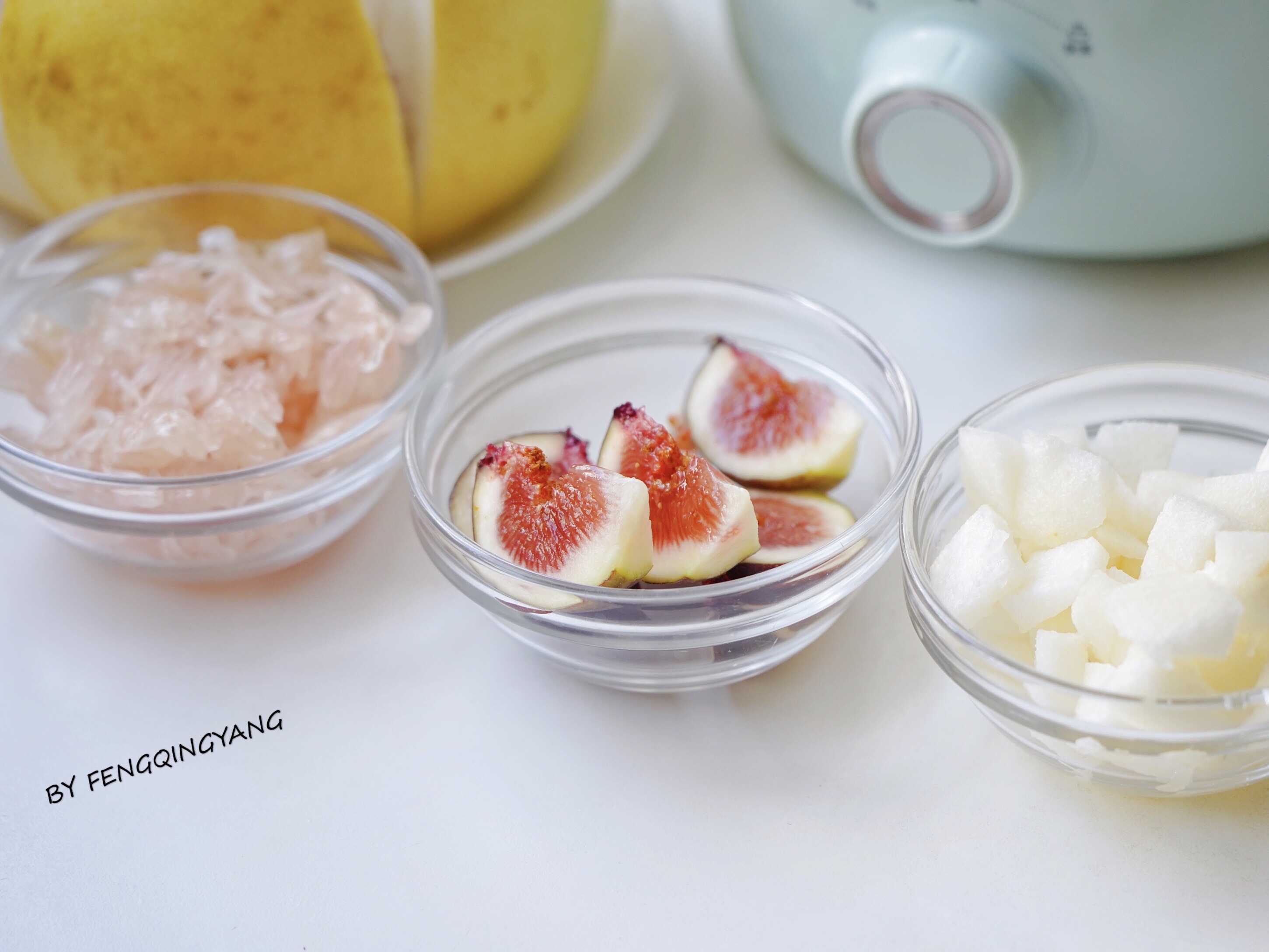 5. 炖银耳时准备水果,梨子切成丁(去不去皮都行),无花果切块,柚子去皮只留瓤,掰碎,枸杞泡水中清洗一下捞出