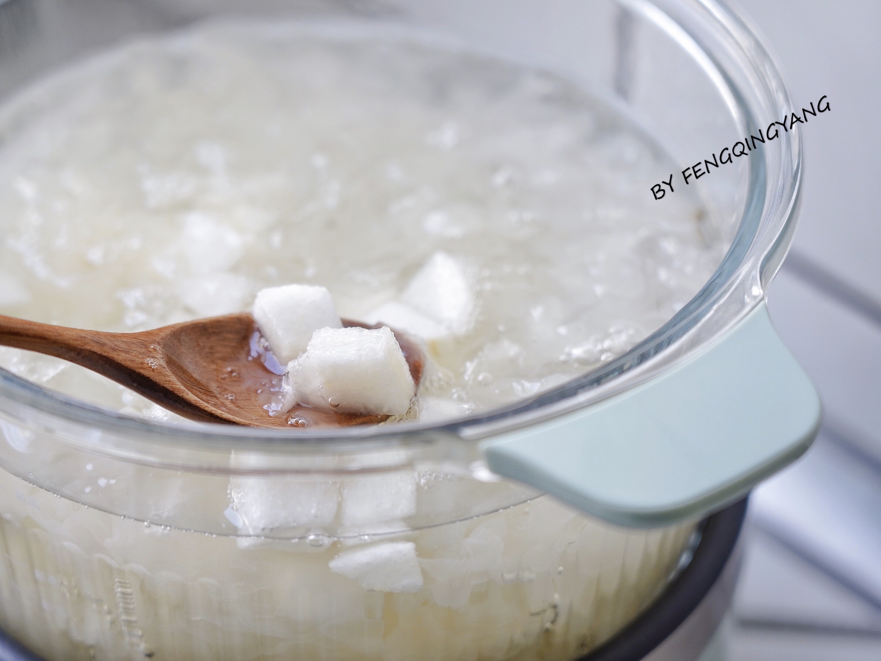 6. 我只煮了四十分钟银耳已经出胶,各种银耳品质不一样,要根据出胶状况增减时间,出胶后,加入梨子块加盖慢煮十分钟。