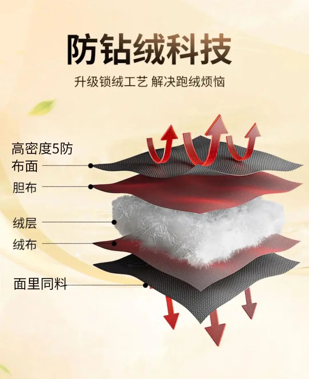 衣服内部由高密5防布面、防钻绒胆布、高纯度绒层、透气绒布等多层材质组成,每一层都经过特殊处理,层层锁住绒朵,形成全方位的“锁绒屏障”。