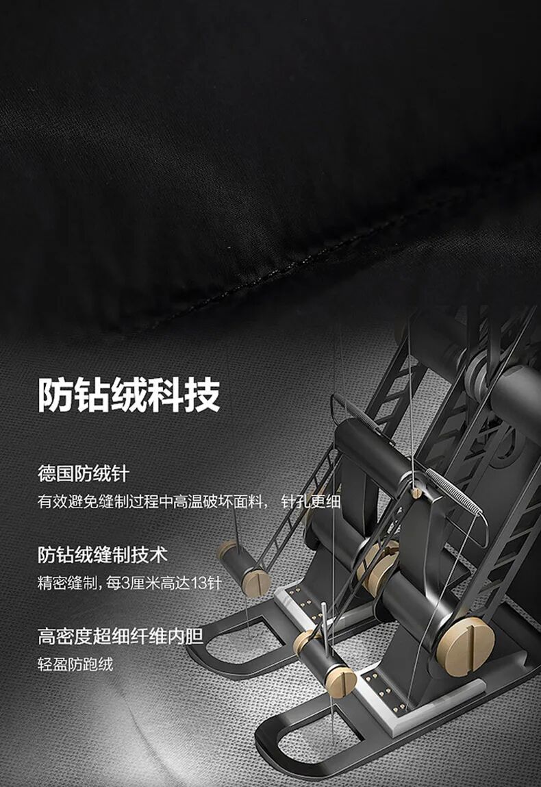 为了彻底解决钻绒跑绒的问题,黑钻3.0鹅绒服还采用了升级的多层层锁绒工艺。