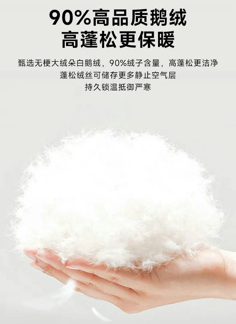 高纯度的鹅绒带来了极佳的蓬松度,用手一捏,能迅速回弹,蓬松饱满的绒朵能锁住大量空气,形成天然的“保暖屏障”。