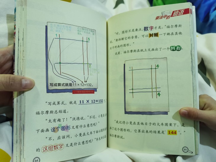 书中的数学游戏吸引了哥哥,虽然对乘法算术还未有概念,但他也能根据福尔摩斯提供的思路算出了那些数字,今天感觉就像给我哥哥上了一堂愉快的乘法算术启蒙课,同时哥哥还学会了镜子反射原理,说下次自己要亲手做一下实验。