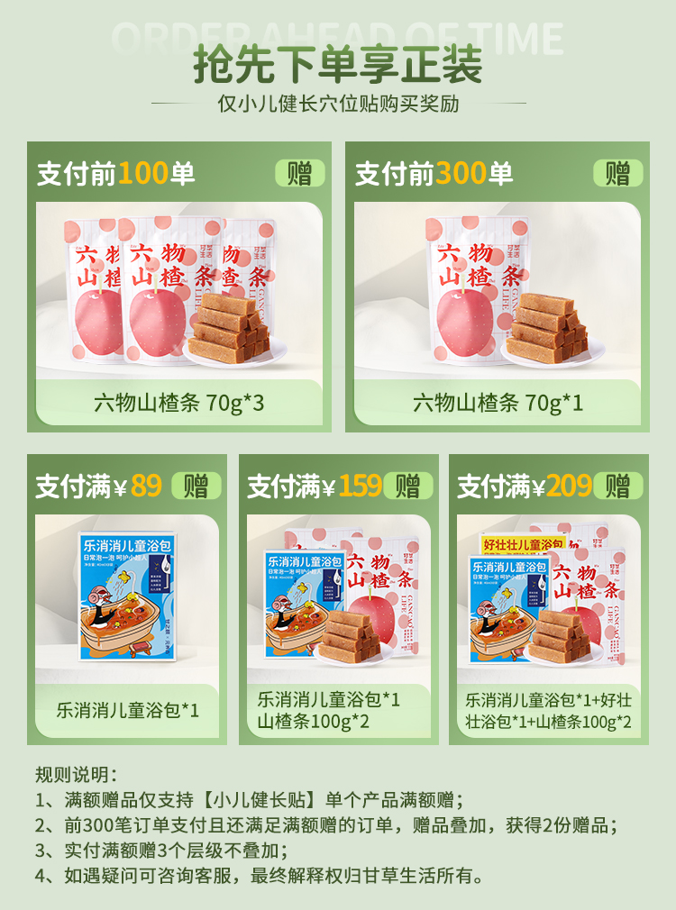 甘草生活春季助长福利,现在下单,支付前300名赠送六物山楂条1袋,满89即可赠送乐消消儿童浴包1盒,更多超值利益如下图~