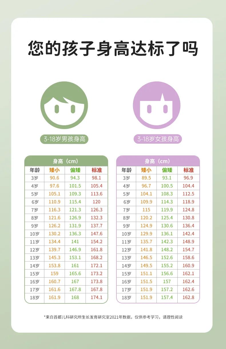 根据首都儿科研究生所生长发育研究室2021年数据,2-18岁孩子的标准身高如下,大家也可以对照看看自己孩子的身高是否达标。