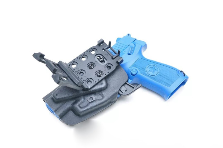 勤务适用,也适合低可视度/隐蔽携行用途的组合。使用常见的开合式腰夹作为枪套的挂载底座,直接夹在腰带上即可使用。请注意:腰夹版枪套不具备快拆功能!