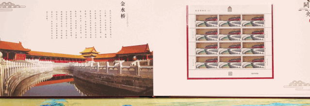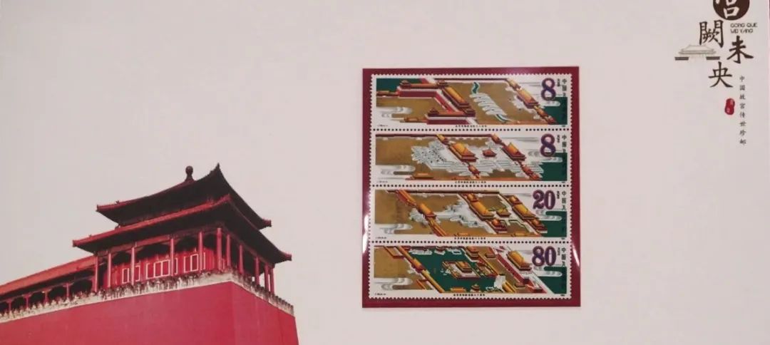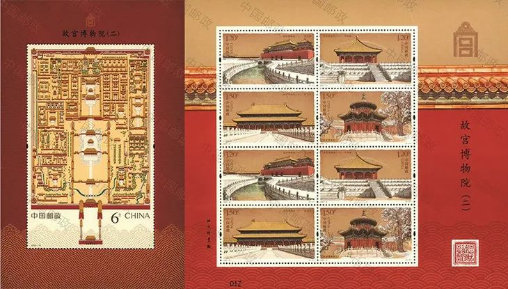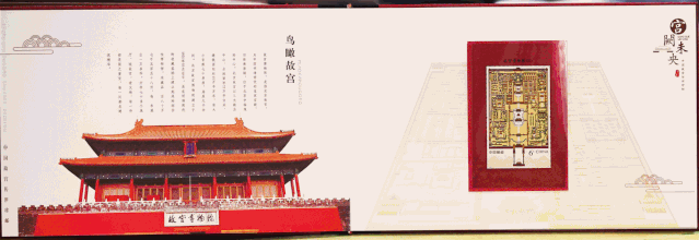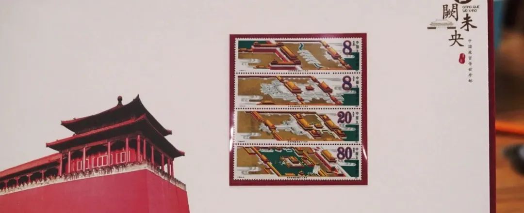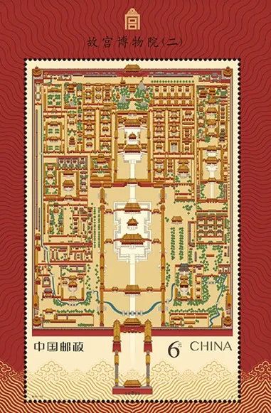采用横长票幅,故宫建筑群的红墙黄瓦、朱楹金扉、青白底座“登”上邮票,表现了中国古代礼制建筑的布局规制,气魄宏伟,规划严整。