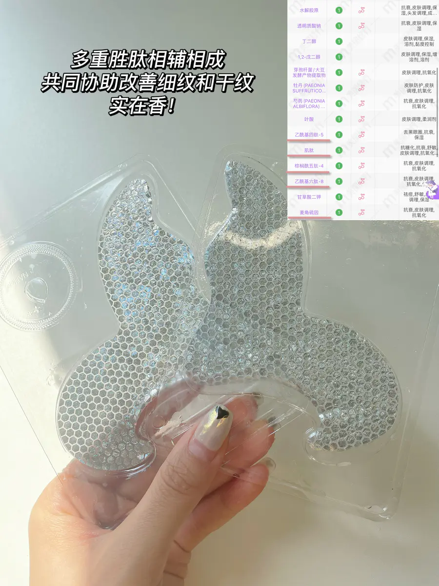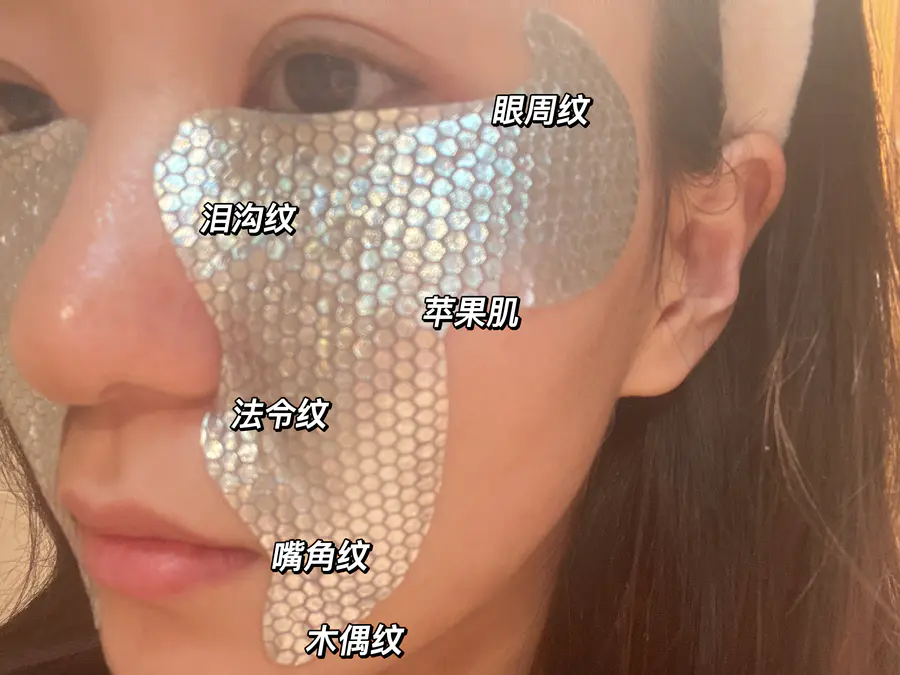 首先说说TA的膜布可以将5大部位-眼角纹,泪沟纹,法令纹,嘴角纹以及木偶纹全都覆盖住。而且眼膜的样子也很好看,每次敷的时候都忍不住要拍好多照片
