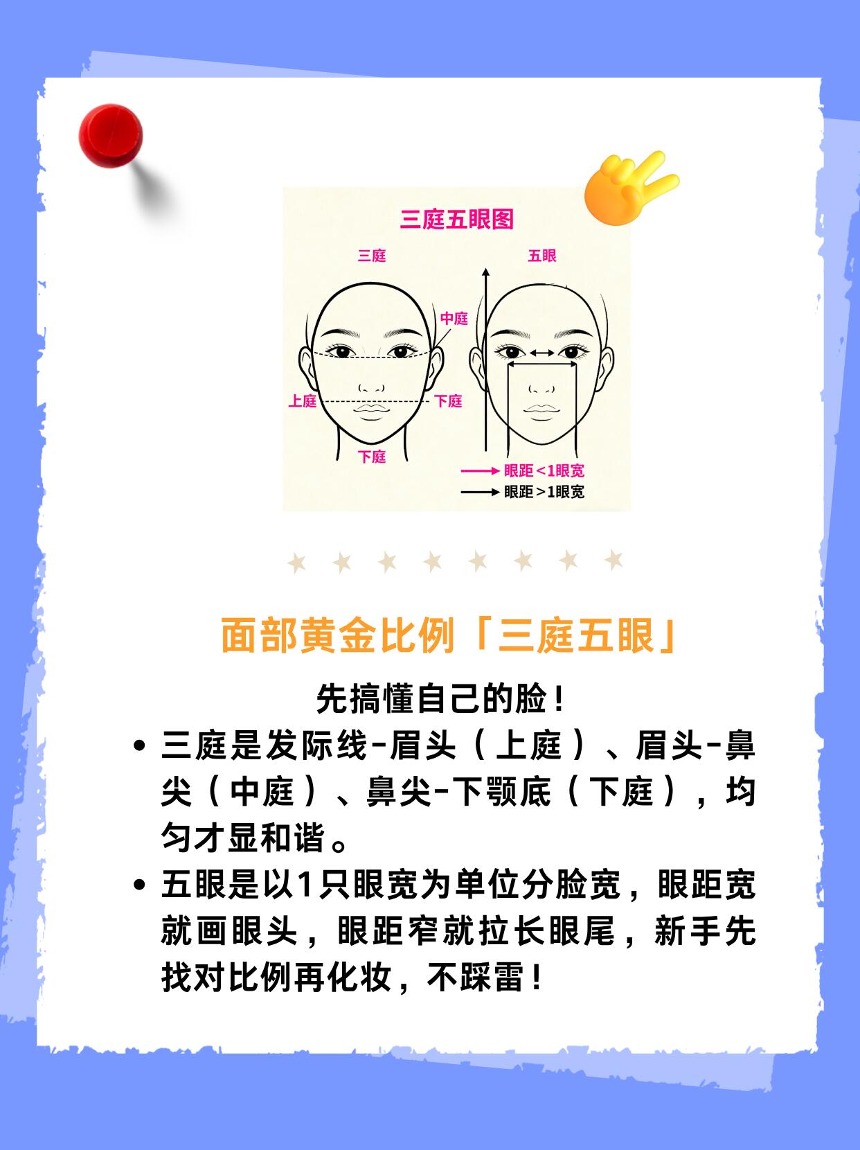 ▫️三庭:发际线-眉头(上庭)、眉头-鼻尖(中庭)、鼻尖-下颚底(下庭)