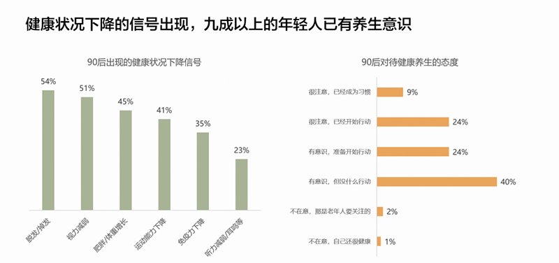 在这些年轻的群体中,54%的人担心脱发和掉发,51%出现视力减弱,45%的人有体重增长,41%的人感觉运动能力下降,35%自我感到免疫力下降,23%发现有耳鸣的现象。这组数据来自第一财经商业数据中心发布的《年轻人养生消费趋势报告》,通过这组数据看到健康下降的信号,这些亚健康状态正在摧毁着年轻人的健康,90后和00后学60后养生也就不奇怪了。