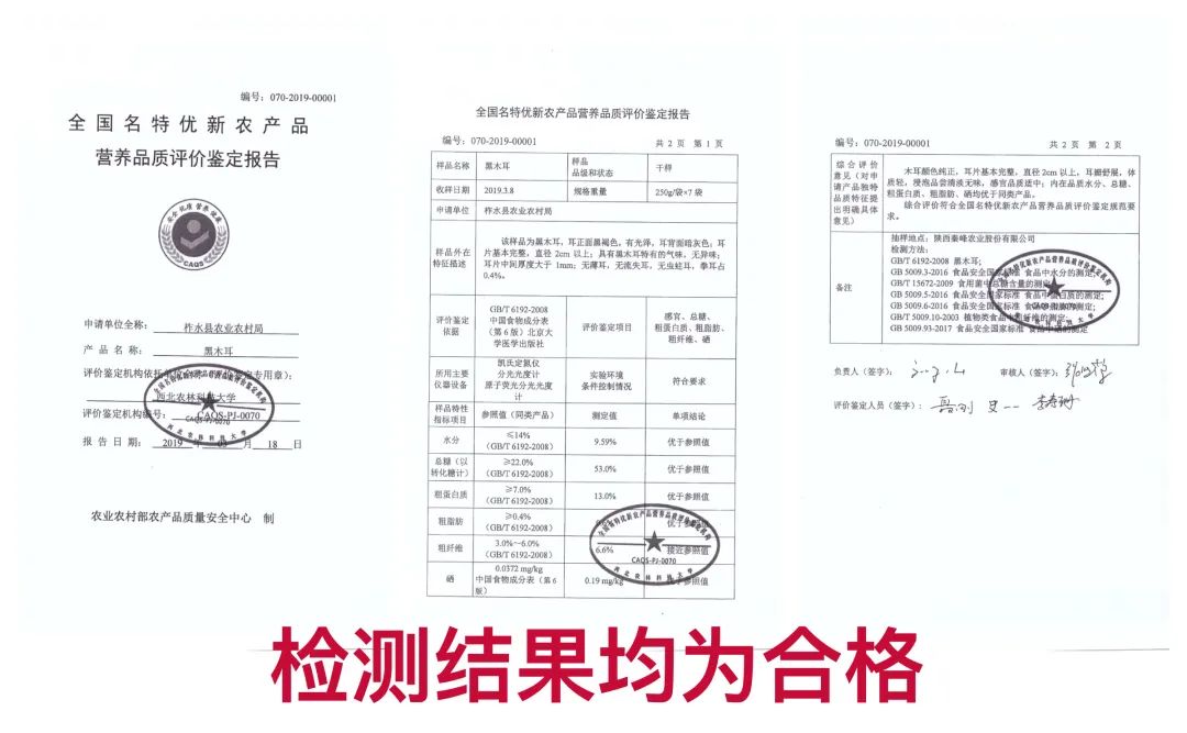 柞水小碗黑木耳还因口感、营养、绿色种植达标,获得了国家地理标志保护产品认证、⽆公害农产品认证等各种荣誉证明。