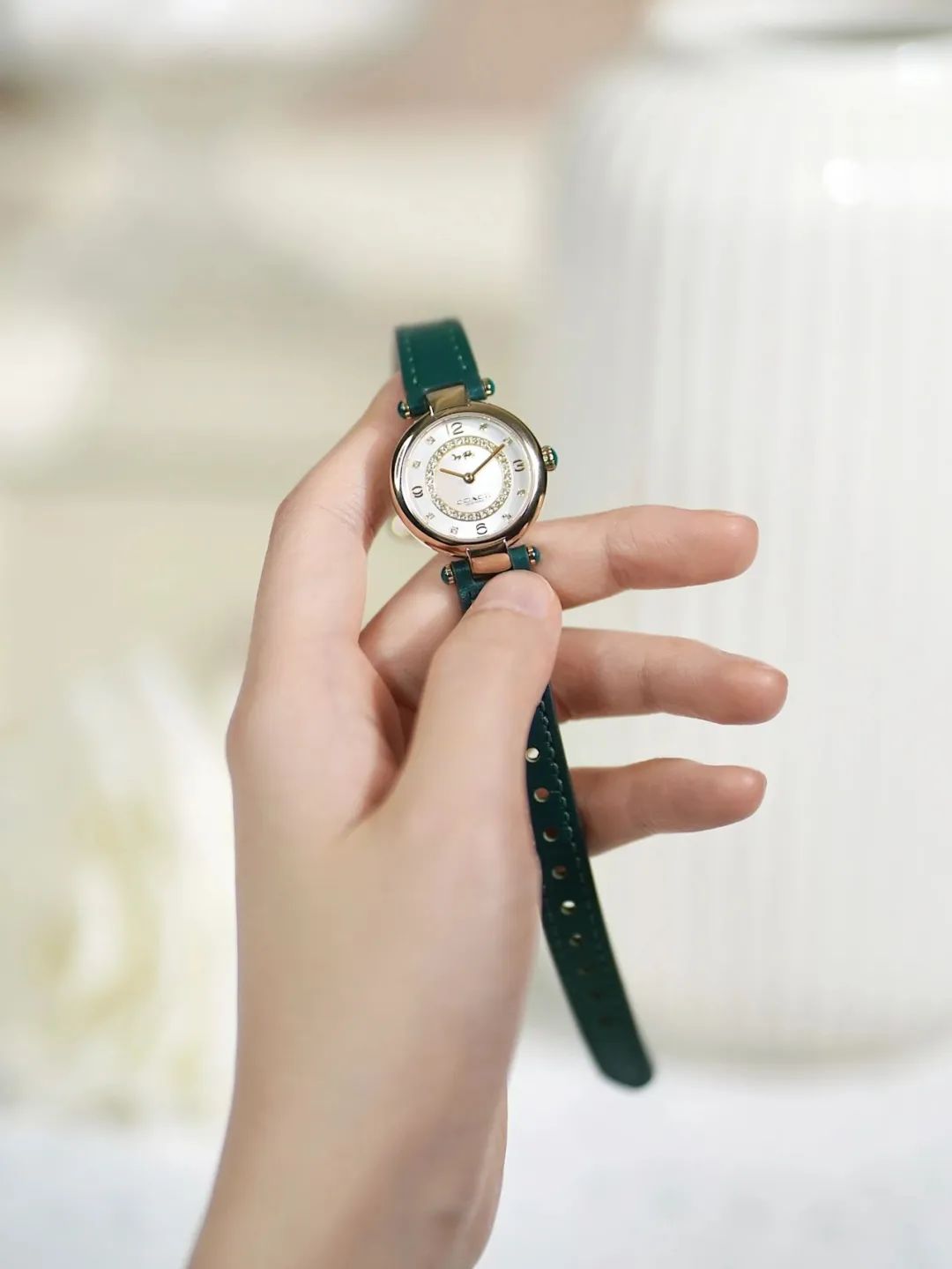复古绿中再点缀上亮闪闪的人造水晶刻度表,瞬间就让这支表鲜活、动感起来,打破生活的沉闷,让普通穿搭不再日常、琐碎。