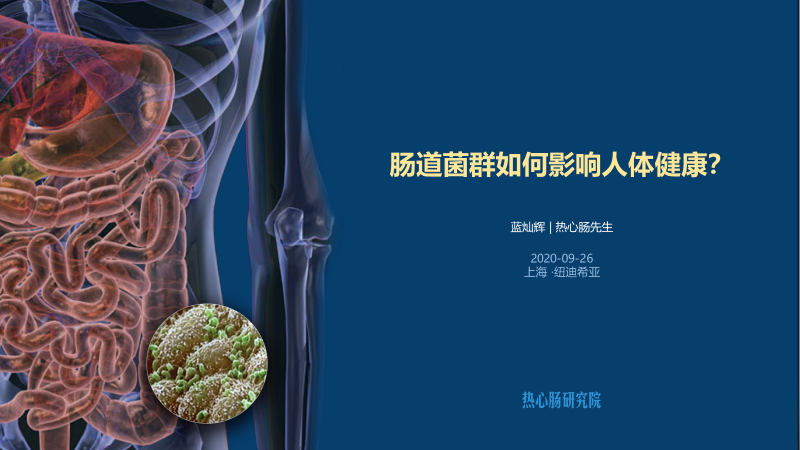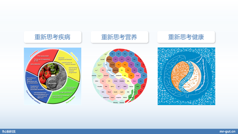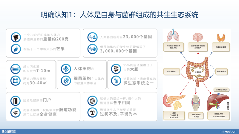 首先这个概念,还是我们最近一直在讲,是我们热心肠研究院提出来的,叫“人类营养命运共同体”。那么关于这个概念,其实我希望给大家介绍三个认知。昨天我也简单介绍过,但今天还特别的展开一点,给大家说一些。我觉得基于这么一个人体与菌群的关系,对我们大健康的专业人士而言,有三个非常重大的认知。