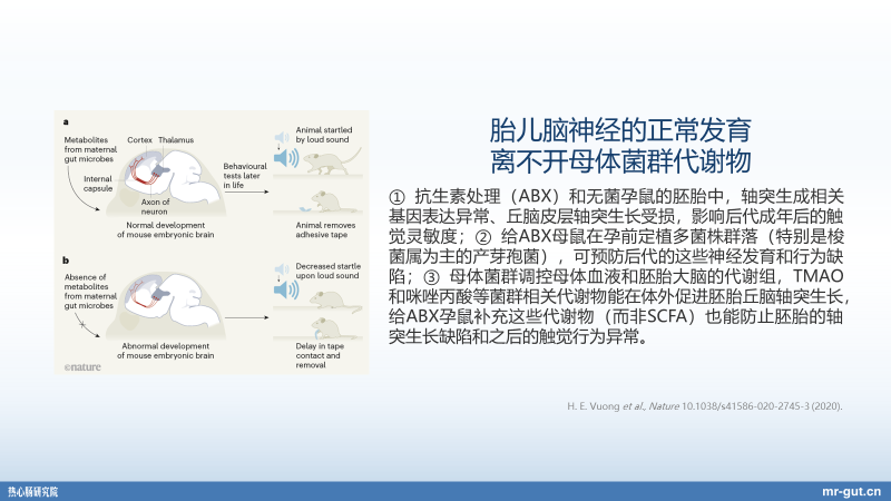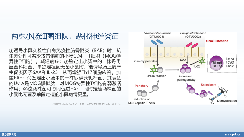 同时,在《自然》杂志上面,实际上在 8 月 27 号也发表了一篇肠道菌群的文章。8 月份,我们整个热心肠日报收集了 8 篇的 CNS 的文章。意味着什么?肠道菌群的领域能够像 COVID-19 或者是像肿瘤一样,在一个月里面,在顶尖的杂志上发出 8 篇的文章。包括这一篇也是非常重要的,脑-肠轴的相关的研究。那么在实验性自身免疫性脑脊髓炎,也就是 EAE 的小鼠当中,就会发现有一株细菌,大家会陌生一点,丹毒丝菌科的细菌。但另外一种细菌,大家应该会听到过,就是罗伊氏乳杆菌。之前在大量的自闭症和神经炎症的过程当中,我们会认为罗伊氏乳杆菌是有益菌。但是现在这个时候,大家就得注意了,我们要非常注意菌株特异性,罗伊氏乳杆菌,我们有非常好的相关的益生菌。但其实特定的菌株,就跟我们的大肠杆菌一样,功能不同。其实,大肠杆菌我们也是有益生菌的,比如 Nissle 1917,但是大肠杆菌也有大量的致病性的有害菌。所以未来比如说在使用针对乳腺炎的菌株的时候,我们要记得我们的唾液乳杆菌 PS2,PS2 菌株才是我们可能要行使作用相关的益生菌。所以最近像昨天晚上(2020 年 9 月 25 日),我们也特别发布了《关于益生菌产业发展的十大趋势》,当中我们特别提到了一定要去理解菌株特异性,尤其我们要理解就是说很多的这种细菌属于同一个种,但是在菌株当中,它可能会有不同的功能和活性。所以我们来看,一开始我给大家介绍说,母亲的肠道菌群的代谢产物会去影响后代的神经发育,刚才还讲了肠神经系统能够独立地去调控血糖,我们还讲了这么一个自身免疫性的脊髓炎,它实际上也是一个肠-脑轴相关研究。
