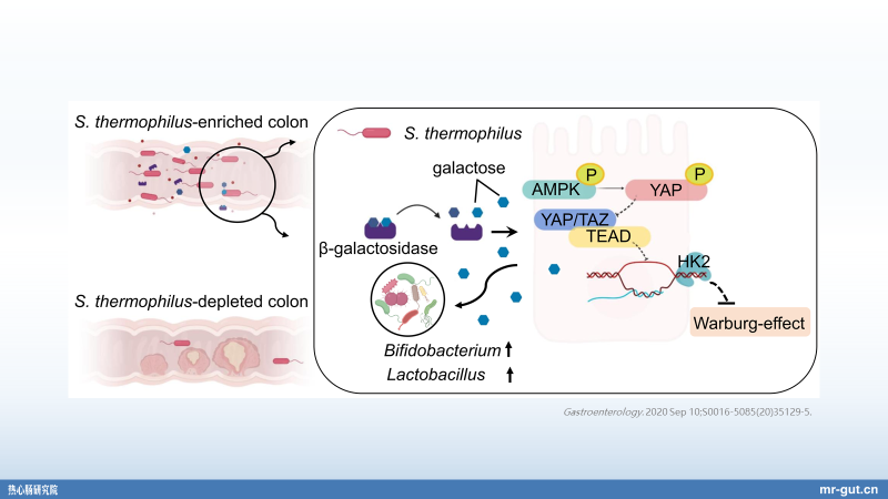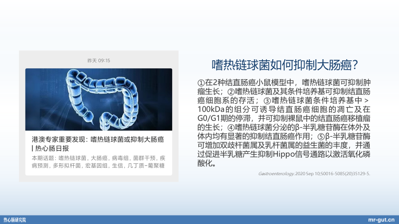 Gastroenterology 上面发了一篇文章。它实际上是发现,这一株菌在大肠癌的病人的肠道里面会比较少,在正常人的肠道里面嗜热链球菌的丰度比较高。然后他把这一株菌分离筛选出来了以后,在小鼠当中就发现它能够相对比较显著地去抑制肿瘤的发生。