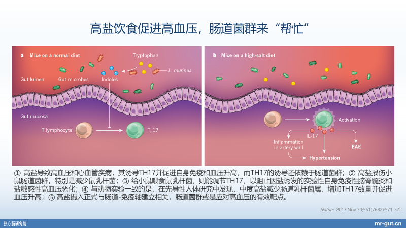 那么在 2017 年,我们也看到是在《自然》杂志上面,发现肠道微生物与 Th17 细胞能够有非常密切这种相关,我们就不展开讲了。实际上这里面已经找到了一些相关机制,包括我们前面讲的非常多了,影响大脑的功能。大家如果有兴趣,可以在我们的热心肠日报当中,其实可以去搜索“一图读懂”,这些只要是我幻灯片当中是中文的图片,都是在一图读懂当中,大家可以看到的,大家可以去理解。