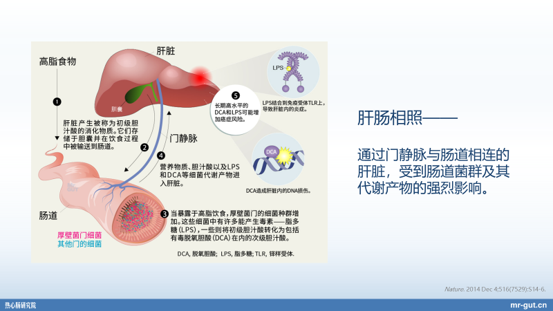 包括比如说如何去影响肝脏的功能,我们知道我们肠道的相关的营养物质的吸收,要经过门静脉,然后在肝脏当中去解毒,进行二次的一些代谢,然后等等这些相关的后续的过程,然后再回到心脏,然后整个输送到全身去。那这个过程当中,如果肠道菌群的这种相关代谢是平衡的,对于肝脏是友好的,但是如果它是失衡的,那么实际上不少的代谢产物,甚至包括微生物本身移位到肝脏当中,会造成肝炎,进而有肝硬化以及未来肝癌的这种相关发生。