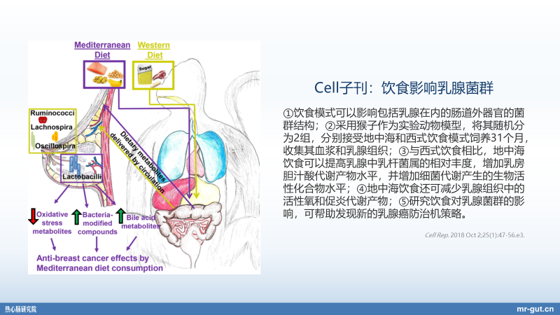 包括还有个非常重要的概念,菌群、免疫、代谢是密不可分的。我们就会发现,在正常情况下和病理情况之下,我们都会同时的看到菌群、免疫、代谢产生失衡的问题。所以在这个角度来讲,我们以前确实是忽略它了,实际上就像是我们消失的另一半似的。我们一辈子几十年的时间,只是在过去 5 到 10 年的时间,都不能在 10 年以上的时间维度说,我们有多大的认知,当然 20 年以前、30 年以前,有一些这样相关研究,但只有最近短短 5 到 10 年的时间,我们才真正把消失的一部分,把它给找回来。然后我们去研究它的这种相关的生理机能作用,包括比如说我们说今天所提的非常重要的一个肠外的这种相关器官——乳腺它都跟肠道连在一起。比如说,今天我们说不同的这种饮食,实际上它会让我们女性的乳腺里面的这种菌群不一样。刚刚,也在 18 年的时候,也有一篇文章发在