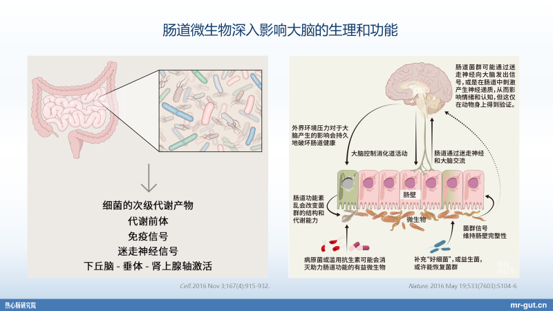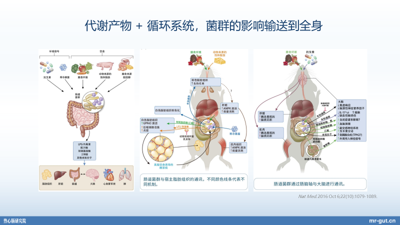 其实是这样子的,因为我们的这种代谢和免疫和神经的这种相关影响,不少是全身性的,比如说我们的淋巴循环,比如说我们的血液循环,都会把这些营养物质的代谢产物带到全身去,甚至就是细菌本身的异位和移位,都会移到这种全身各处去。另外实际上,我们在整个的过程当中,肠道菌群、免疫、中枢神经系统,实际上它是相互交联在一起的。具体也不展开讲了,如果大家有兴趣的话,欢迎去查我们的“一图读懂”。