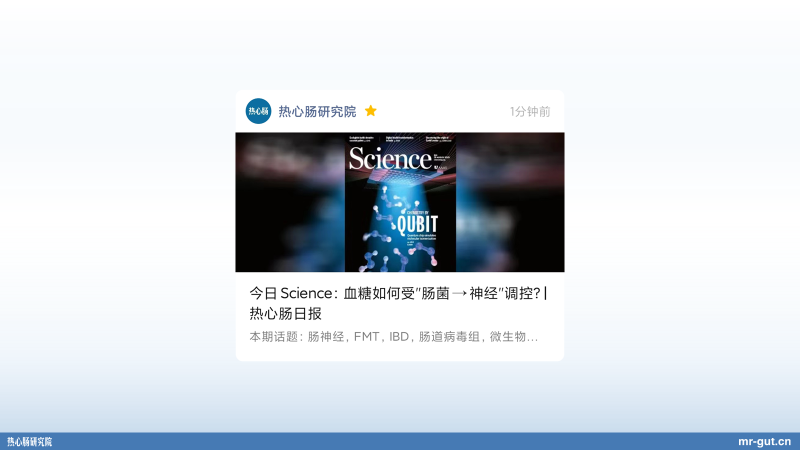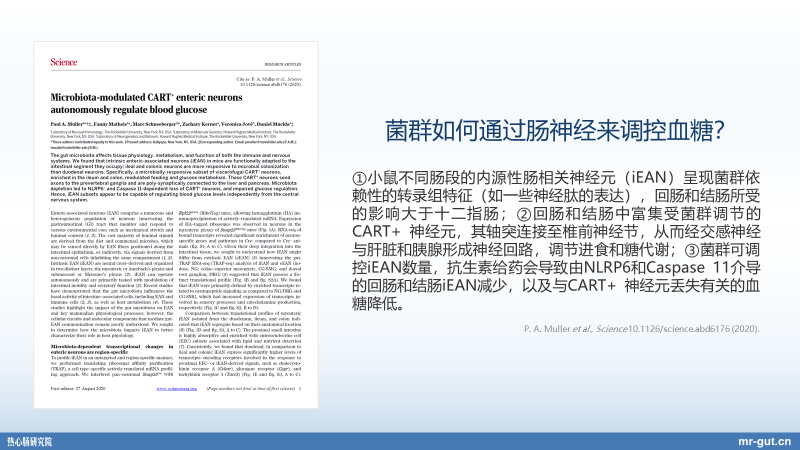 Science 上发的一篇文章,非常重要的文章。我们之前说,血糖控制是需要我们的神经系统,尤其是中枢神经系统,向胰脏、肝脏提供一些信号的。但大家知道,其实我们肠道里面有个独立的神经系统吗?就是肠神经系统。实际上,肠道不仅仅是一个非常重要的消化器官,它还是一个内分泌器官,它还是一个有独立的淋巴,有独立的神经元,有独立的神经系统的器官。而且这个神经系统,现在发现可以跟肠道菌群去互作,独立地就可以向我们的胰腺,向我们的肝脏发出信号,然后独立去调节血糖。所以这样的文章刚刚在 8 月 26 号发表在《科学》杂志上。